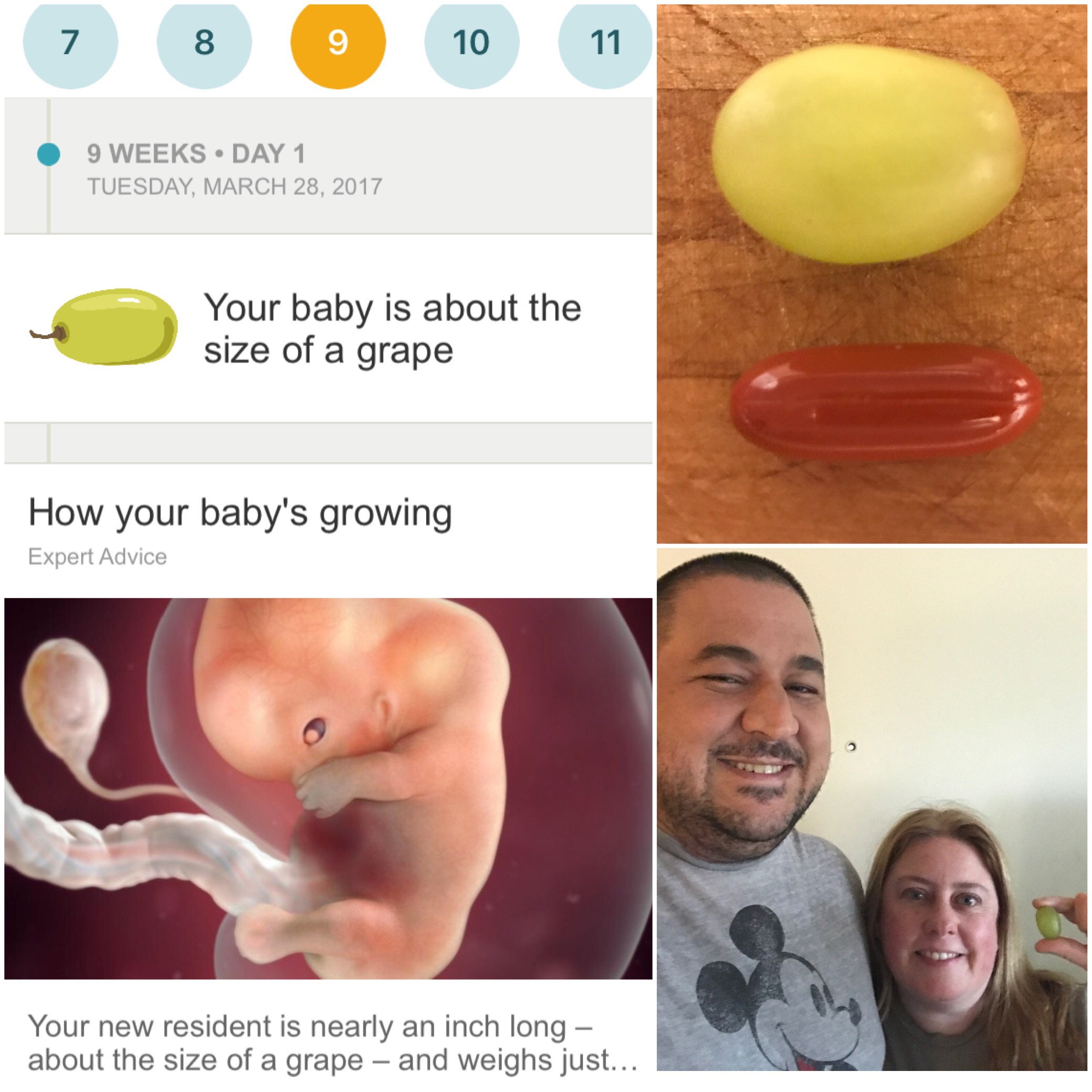 Week nine’s fruit Comparison is the grape, for size comparison I put the chosen grape up to a prenatal with DHA vitamin, the kind that I’ve been taking daily.