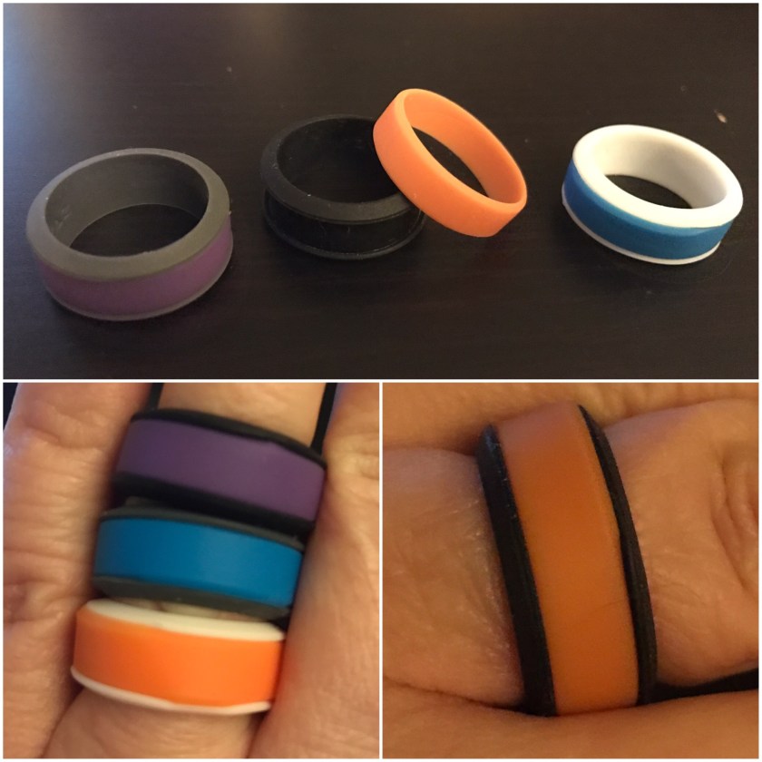 Having purchased the metallic rings, I also wanted rings with more fun colors. I looked around and considered many alternatives before being very intrigued with these UROKAZ rings. Unlike other rings I have seen in my research, these are composed of two bands – a thin band and a thicker one, the thin one fitting into the thicker one. Due to the thickness, the thick one could in theory be worn without a secondary color band inside, while the thinner one could not.