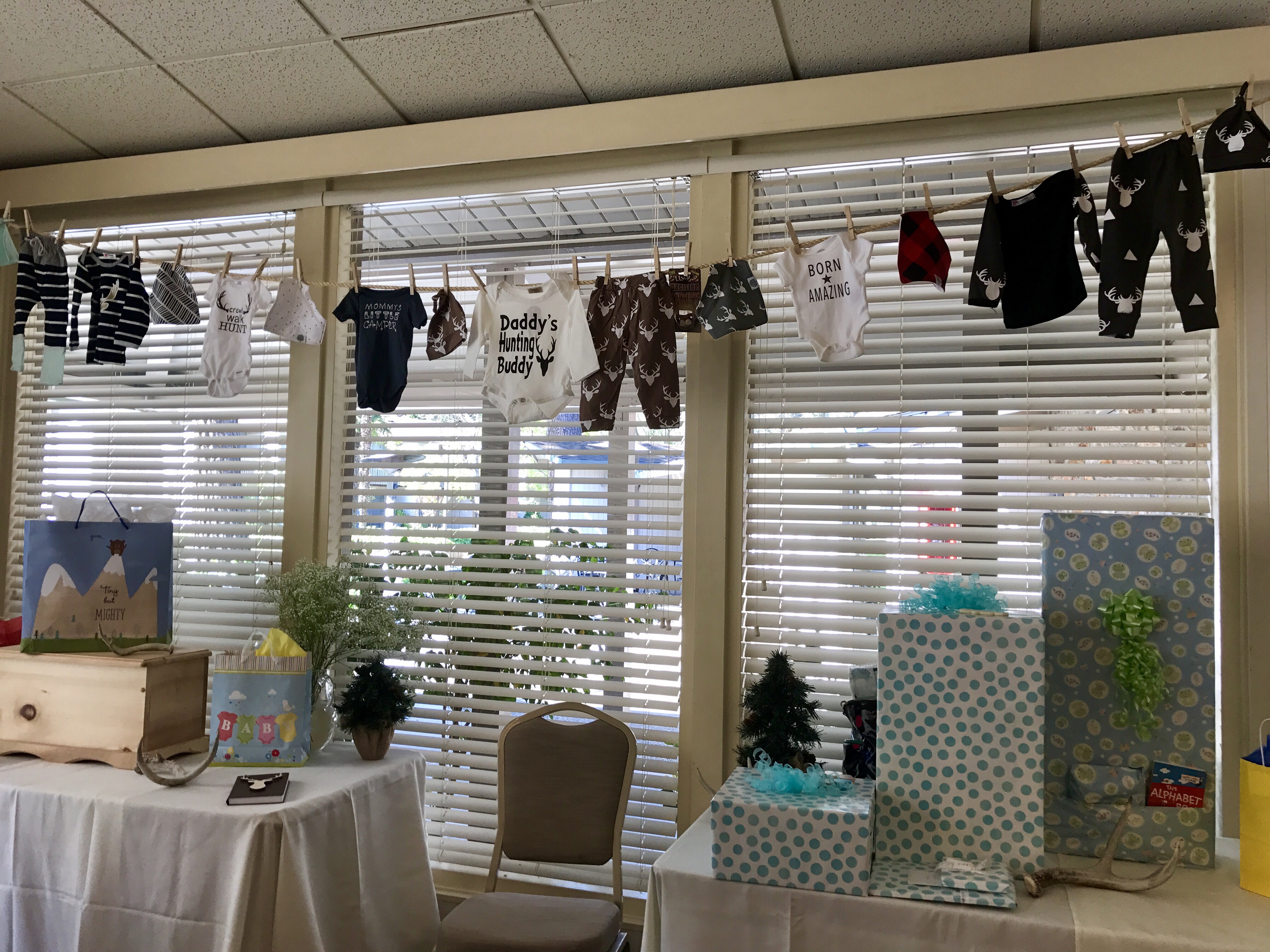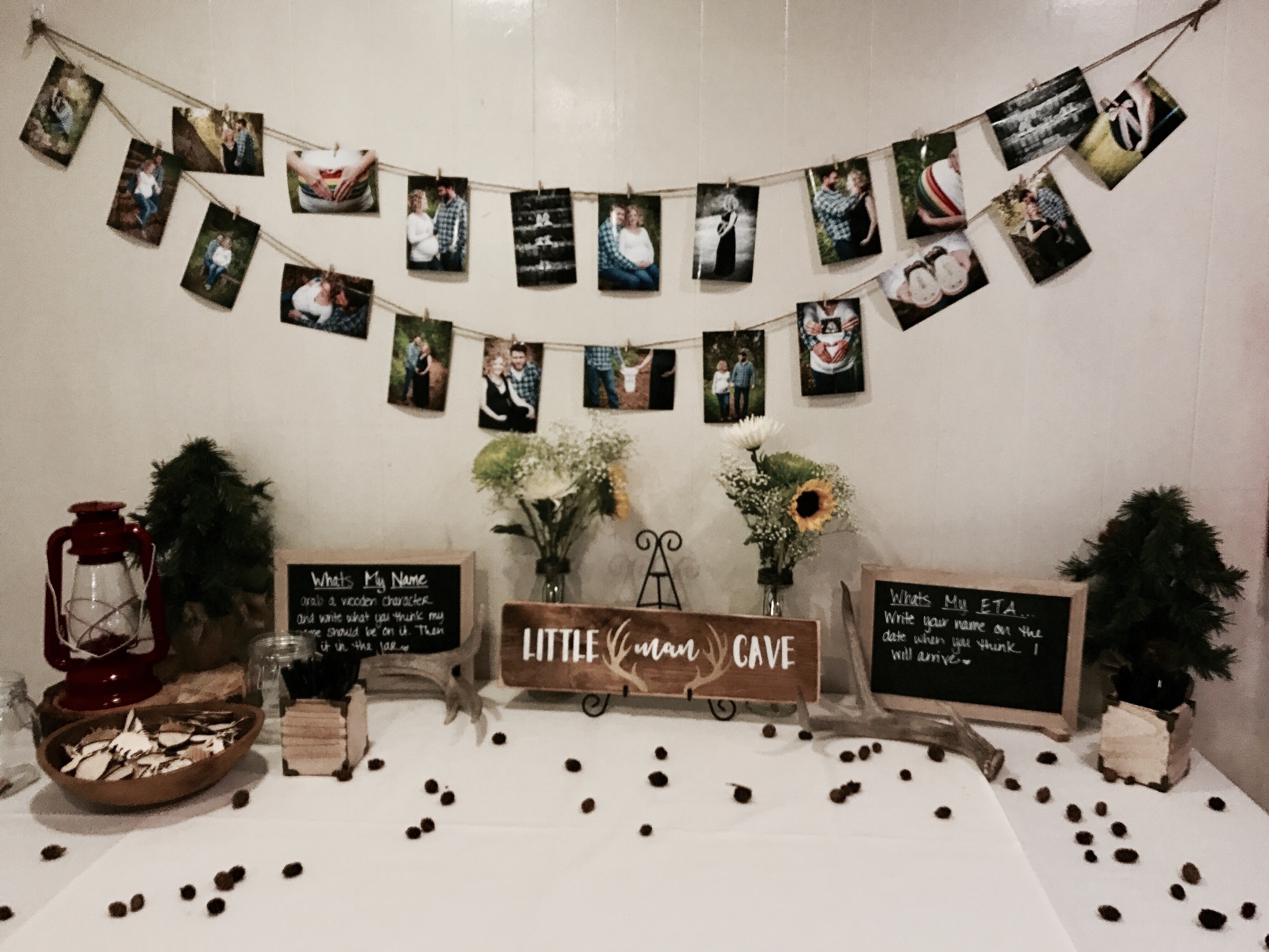 The shower had a camping, hunting and moose theme. Red lanterns, antlers and outdoor touches were everywhere for the shower for their soon to be born son.