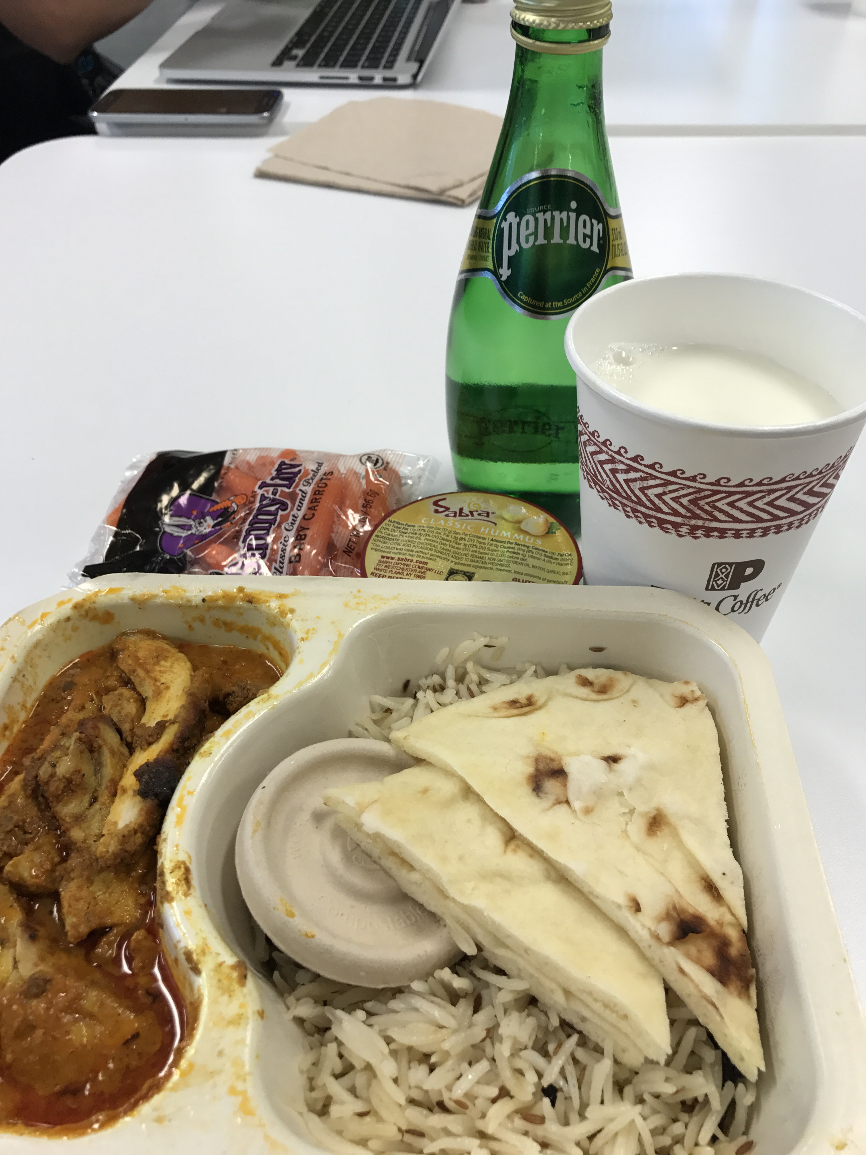 My first day I had the butter chicken and drank Perrier and lots of milk, though I stopped thinking the former last week after learning it may have nitrates and switching to fruit infused Hint water which comes in non-BPA plastic bottles.