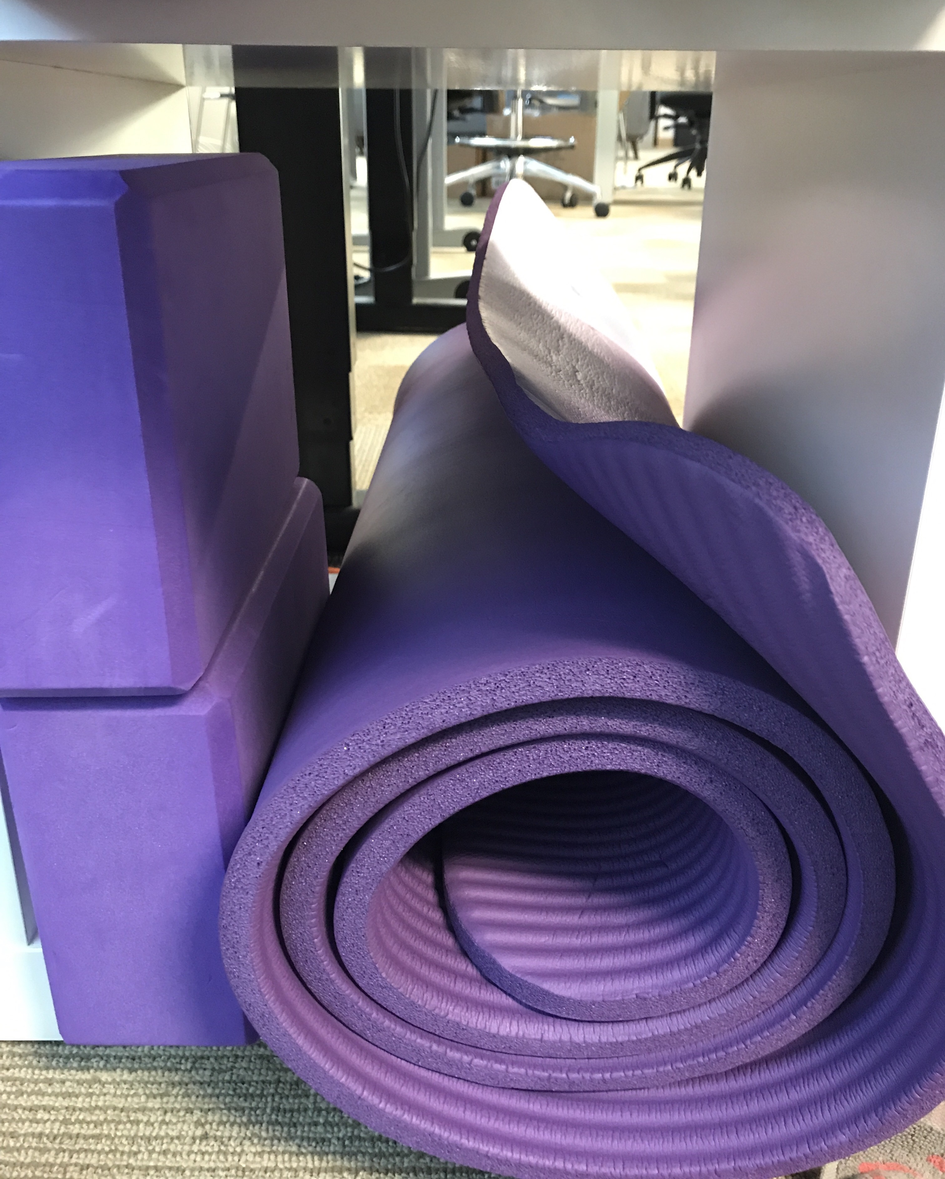 While yoga supplies are provided, some employees bring their own and I’ve brought on my my own mat and bricks. The mat I have is an extra thick one which feels great on my feet and for my back.