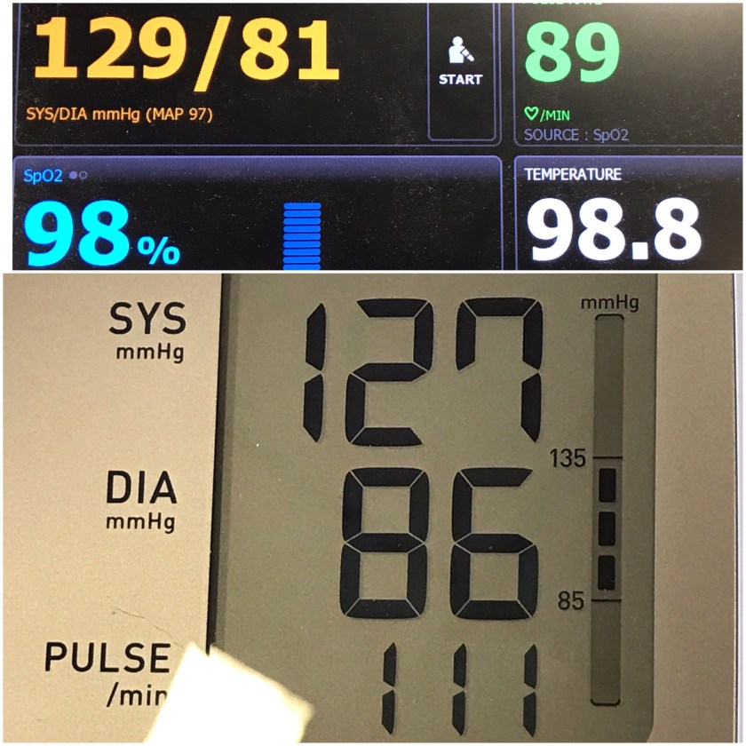 Later as part of my regular appointment the nurse took my blood pressure. The results she got (top photo) and our cuff (bottom photo) were pretty similar though the cuff recorded a much higher pulse.