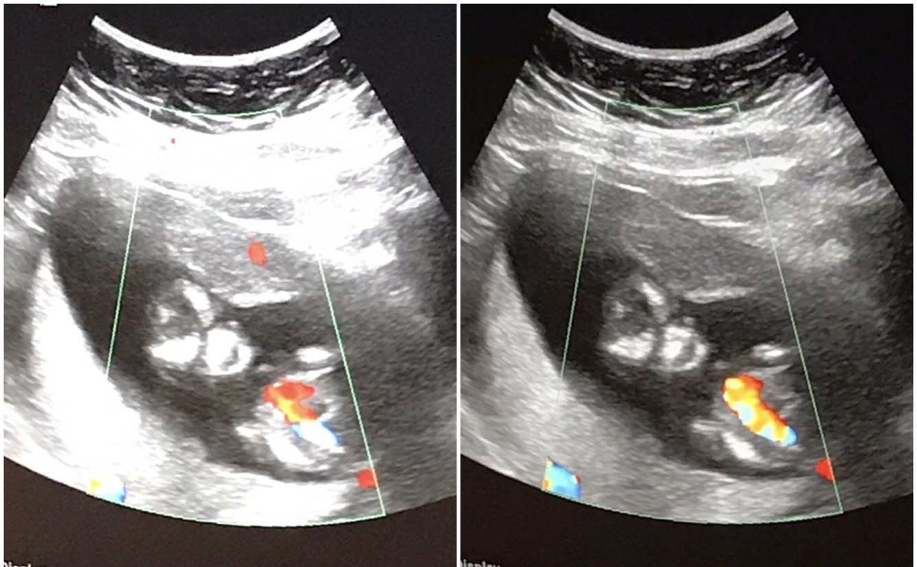 A: Baby has gone through numerous ultrasounds including a very detailed one when I had my NT test and one at every visit with Dr. G except the last one. I haven’t seen baby’s elbows for example, but we’ve seen baby make a fist, we’ve seen baby kick,  and we’ve seen, in beautiful rainbow colors and heard the strong heartbeat, and as far as we know baby has all the parts you’d expect in a healthy, growing baby.