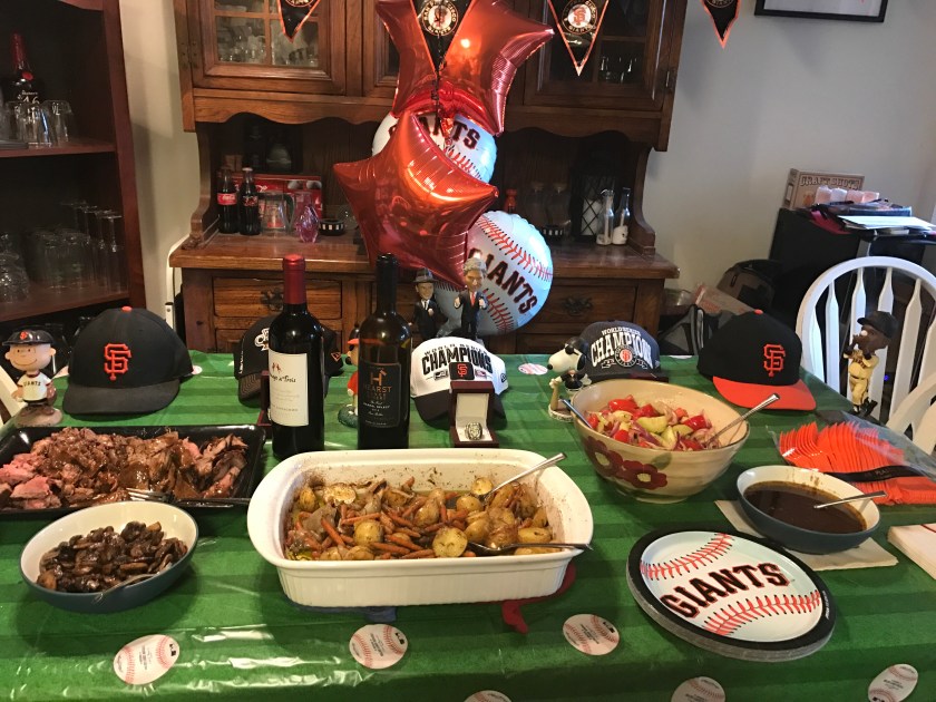 My preganancy has really made me realize how much the option of having alcohol at event is part of the typical party culture. For our Giant’s Home Opening Day party Candy and Matt had both wine and beer as choices. Candy modified her wonderful grilled msushrooms to be cooked without wine and they were still excellent.