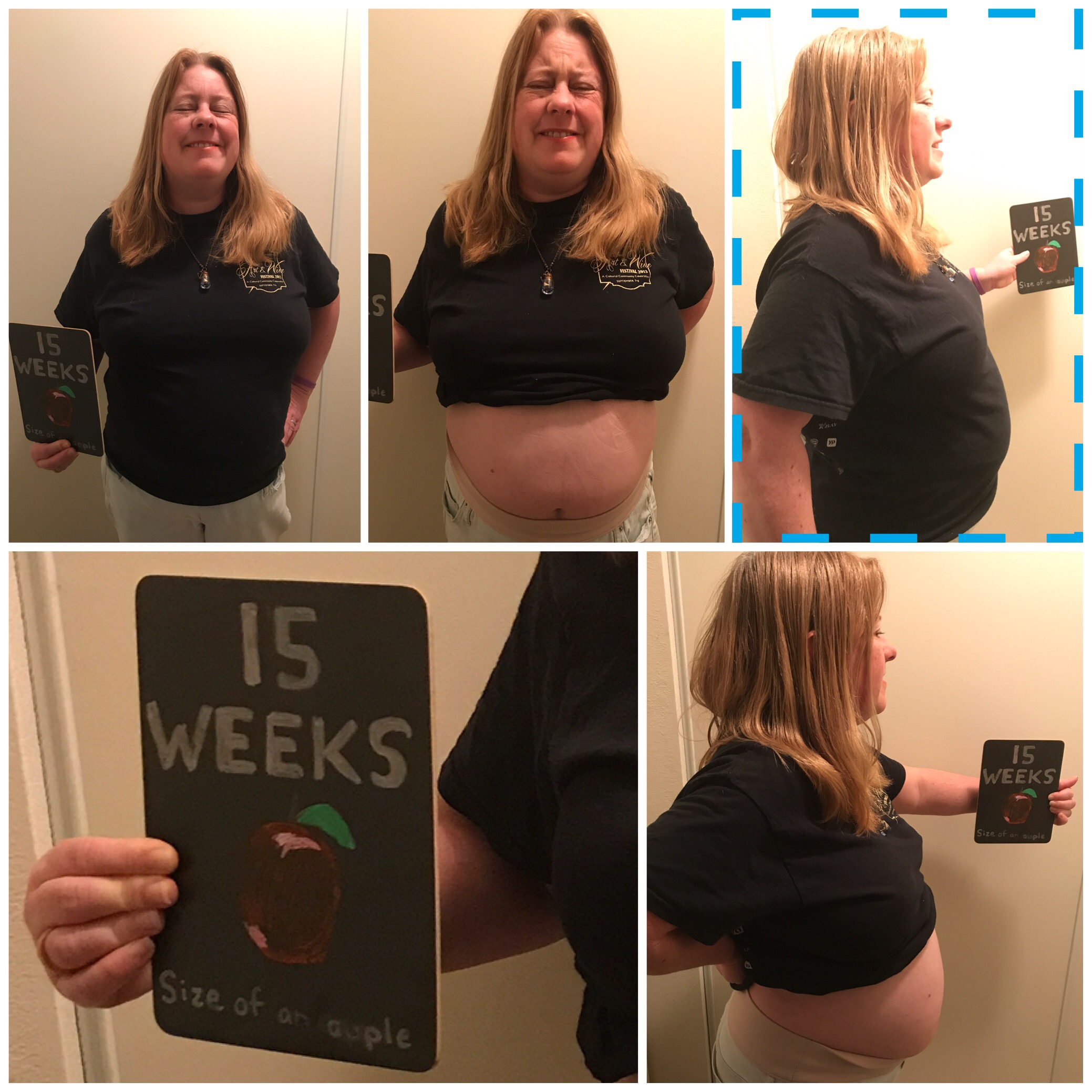 I’ve been having Matt take the photos on Thursdays as it is the last day of that week for my pregnancy. For week 15 we both fell asleep early on Thursday and luckily woke up before midnight. My eyes were shut in all the photos as my eyes were still adjusting to the bright light.