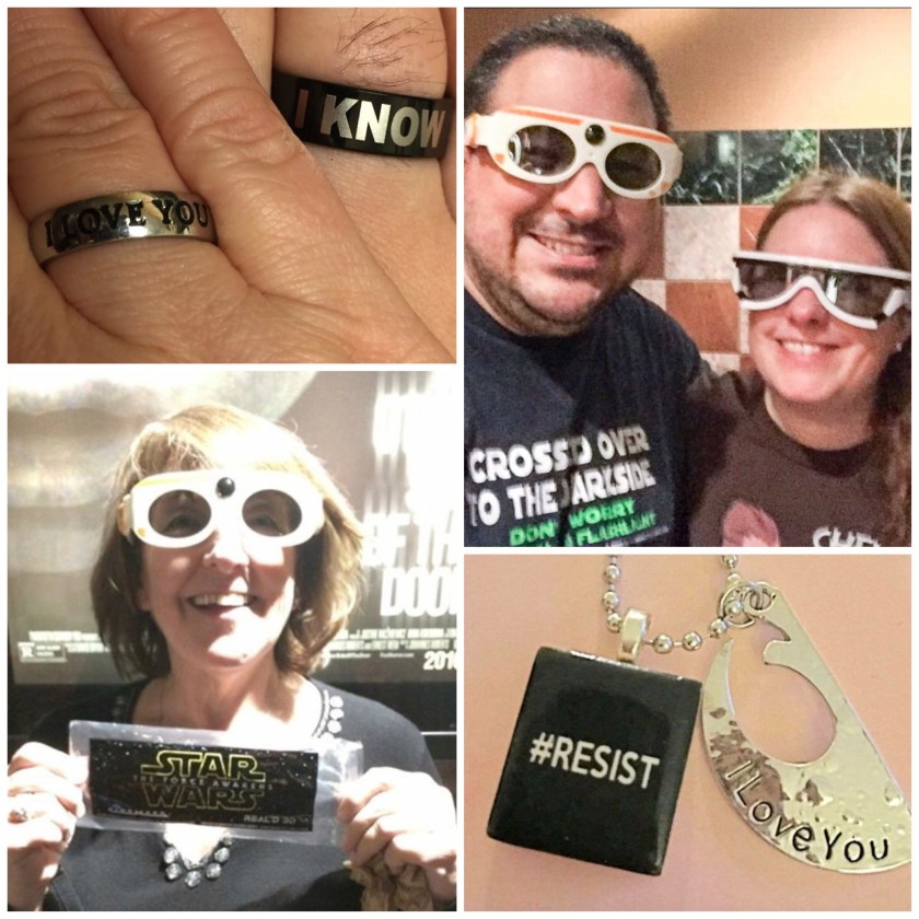 When it was time to see The Force Awakens in December, we all bought character 3-D glasses. That year we gave each other Star Wars stocking stuffers based on the “I love you. / I know.” exchnage from “Return of the Jedi”. He bought us matching rings (when we determined his didn’t fit I bought him a titanium one that did) and bought us the rebel alliance pendants and still wear mine to some political events.