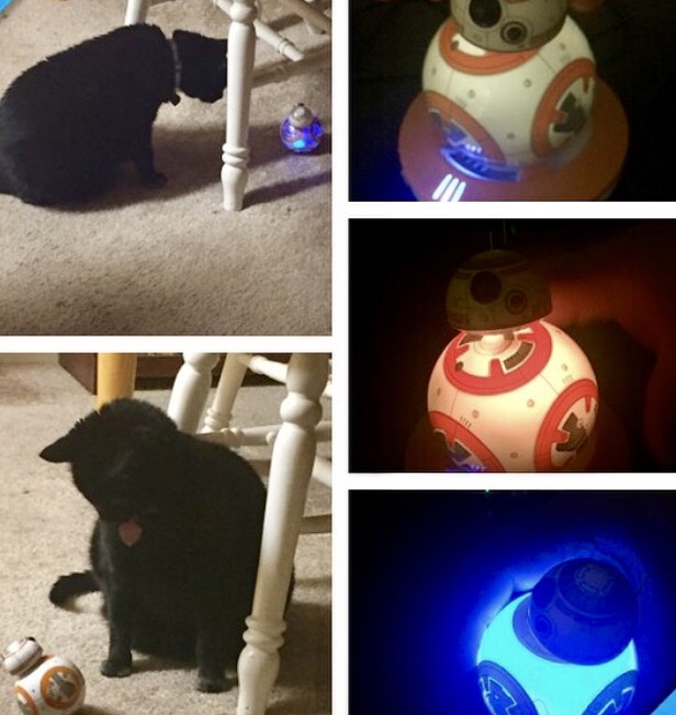 Though we had had a place near the beginning of the line, it turned out our store has not received any BB9’s. We had to order one online and soon received this toy which at first scared, then layer intrigued Inky.