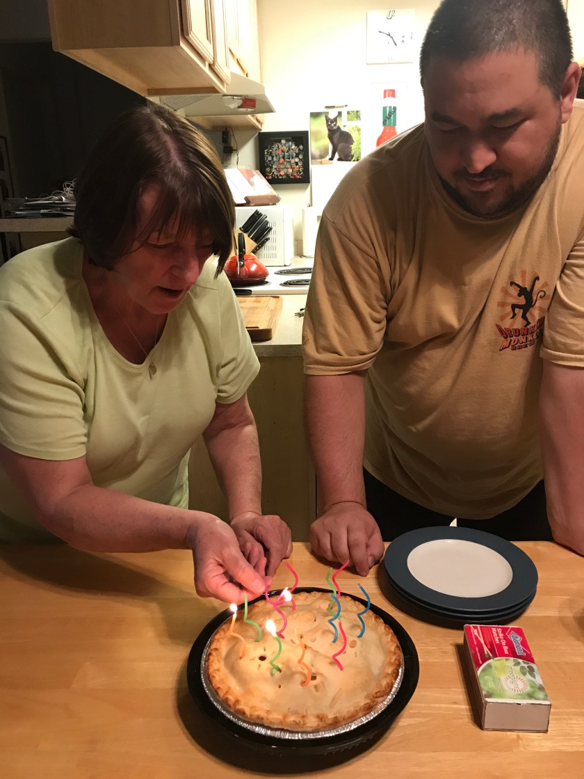 Candy requested apple pie instead of cake. Matt and Candy both tried to use the narrow curving candles to light each other. The candles swayed a bit and even spilled some wax.