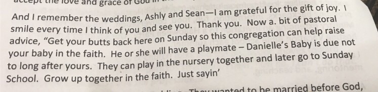 The sermons are printed out so we can follow along. I was especially thankful that this one was as Baby Perri and I got a mention in it.
