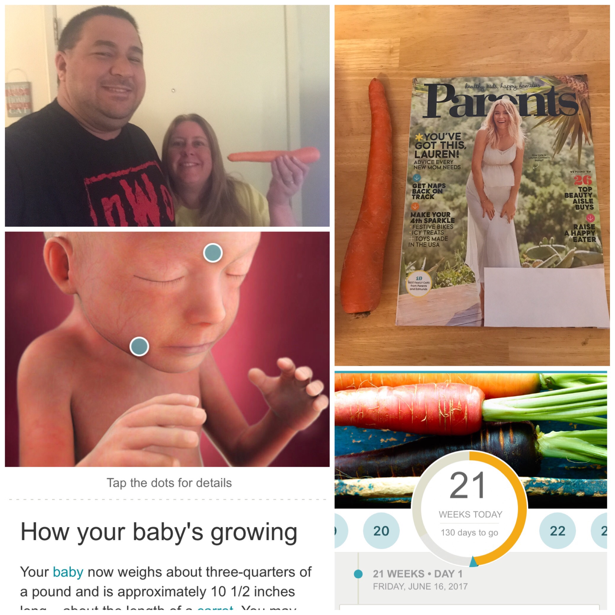 Our baby this week is the size of a carrot, an estimated ten and a half inches in length and 3/4 of a pound in weight. For comparison I put a carrot next to the Parents Magazine that just arrived today starting our subscription. In this week baby begins to swallow as well as breathe in amniotic fluid.