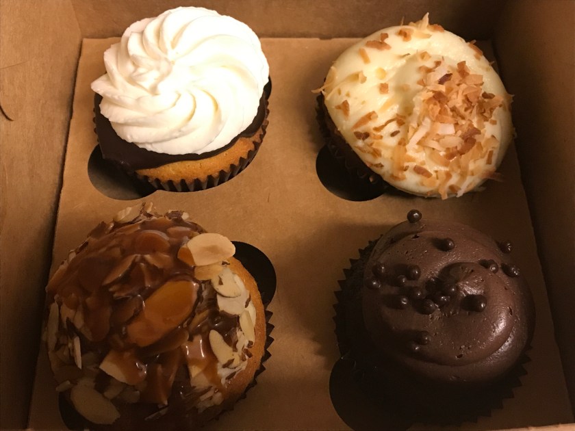 In honor of our active little baby who likes to move around to sometimes to music, mangoes, chocolate or me exercising, I bought Matt and I each two cupcakes. For Matt on the top row Boston CreamPie and Banana Coconut and for me Burnt Almond and Chocolate and More Chocolate.