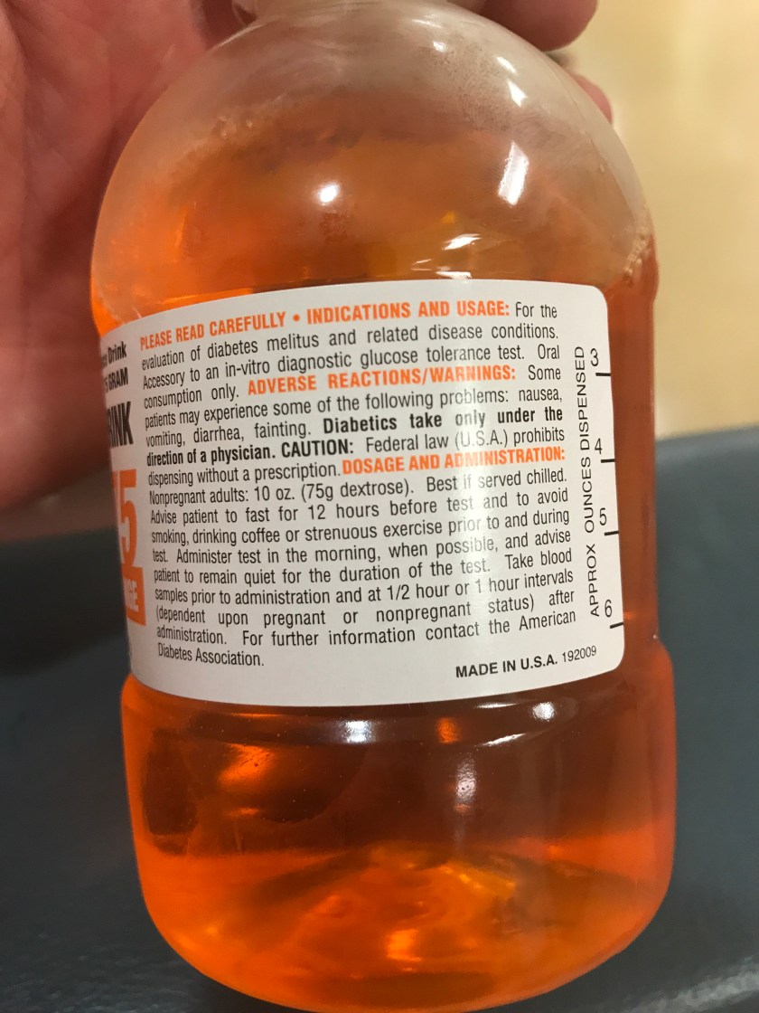 The test starts with a blood test. Then you are given an extra sweet drink to drink. You have to drink it all in 5 minutes or less, or you automatically fail the test. The technician suggested drinking it fast so it would be easy to get it all down.