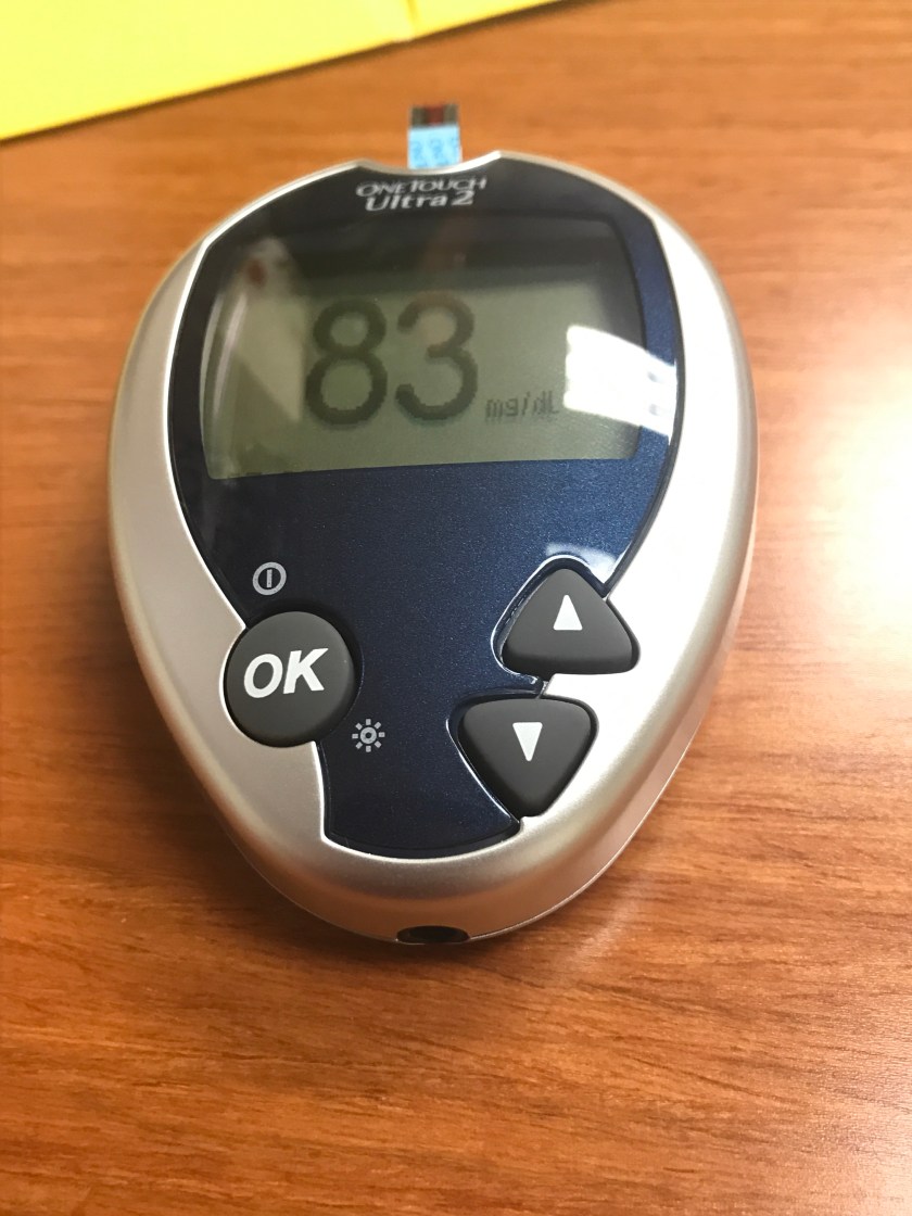 In the end with a lot of encouragement and coaxing, I was helped to take my first reading. Alison had to help me squeeze my finger to get drops of blood out. Though I won’t be pale white and shaking after this I won’t have any help, either.