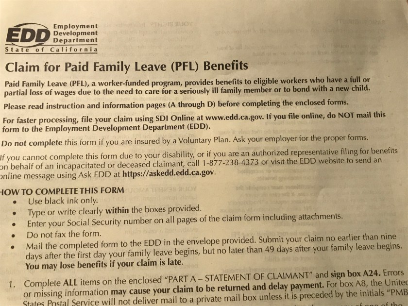 I did not know that I had to wait till 8 days to file the paper and that it would be sent back to me if filed too early, instead of them holding onto it. It would take 2-3 weeks to process. After my pregnancy disability period was over (6 weeks after the birth, or 8 weeks for a Cesarean Section, I’d be send Paid Family Leave paperwork.