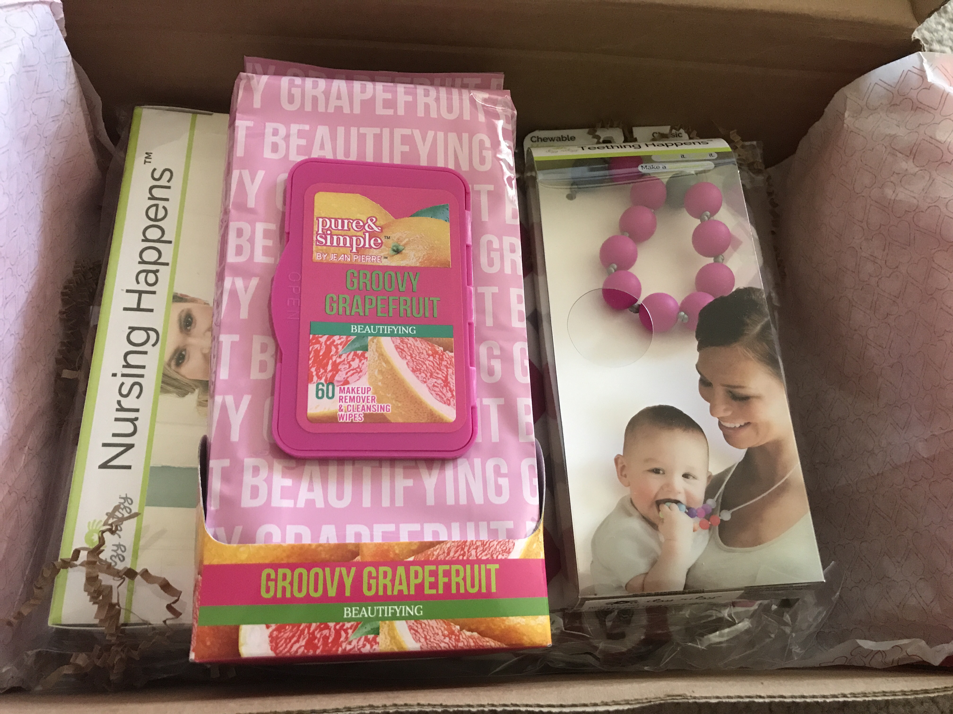 I received the July Bluum Box and inside three items had pink as a color in them and the fourth item and wrapping was a red shade. The presentation of the box was just beautiful and one of my first thoughts opening this was how two items inside were similar to items that had been on my Amazon baby gift registry – the chewable teething necklace and the nursing scarf.