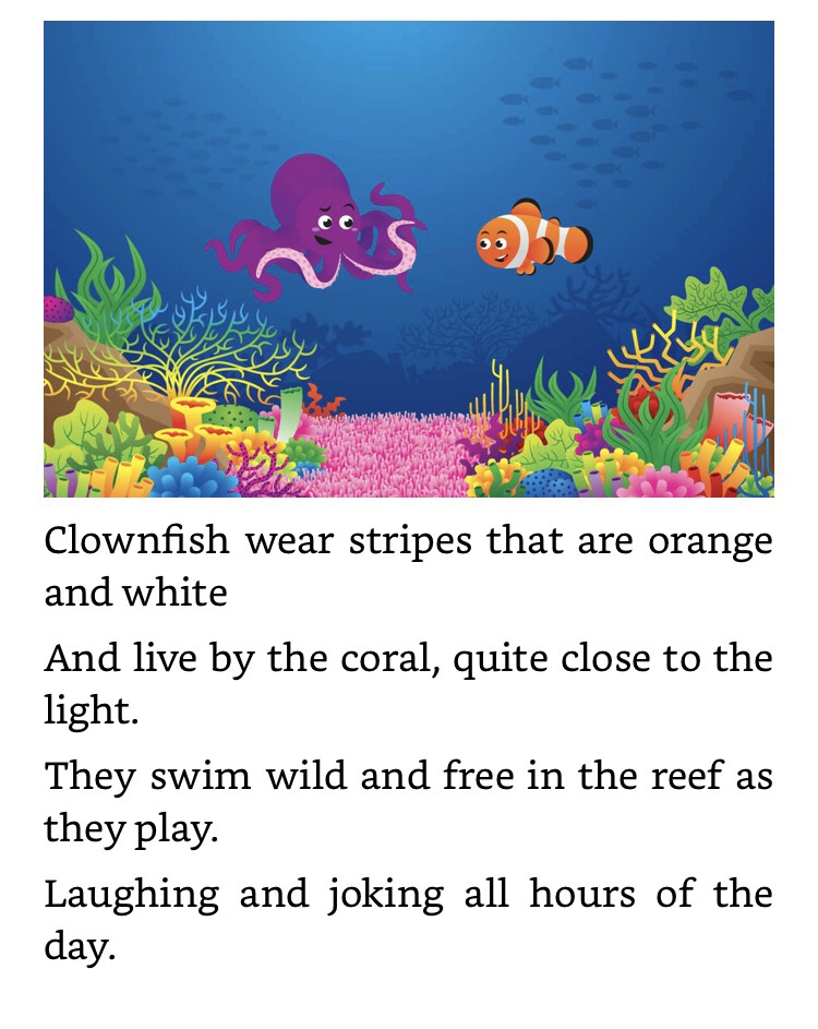 The book is made up of very colorful and accurate pictures of sea creatures, complete with adorable expressions on each of their faces. It quickly sets up the rhyming story of Jasper, our main character, a lovable yet flawed Clownfish, who is destined to find trouble.