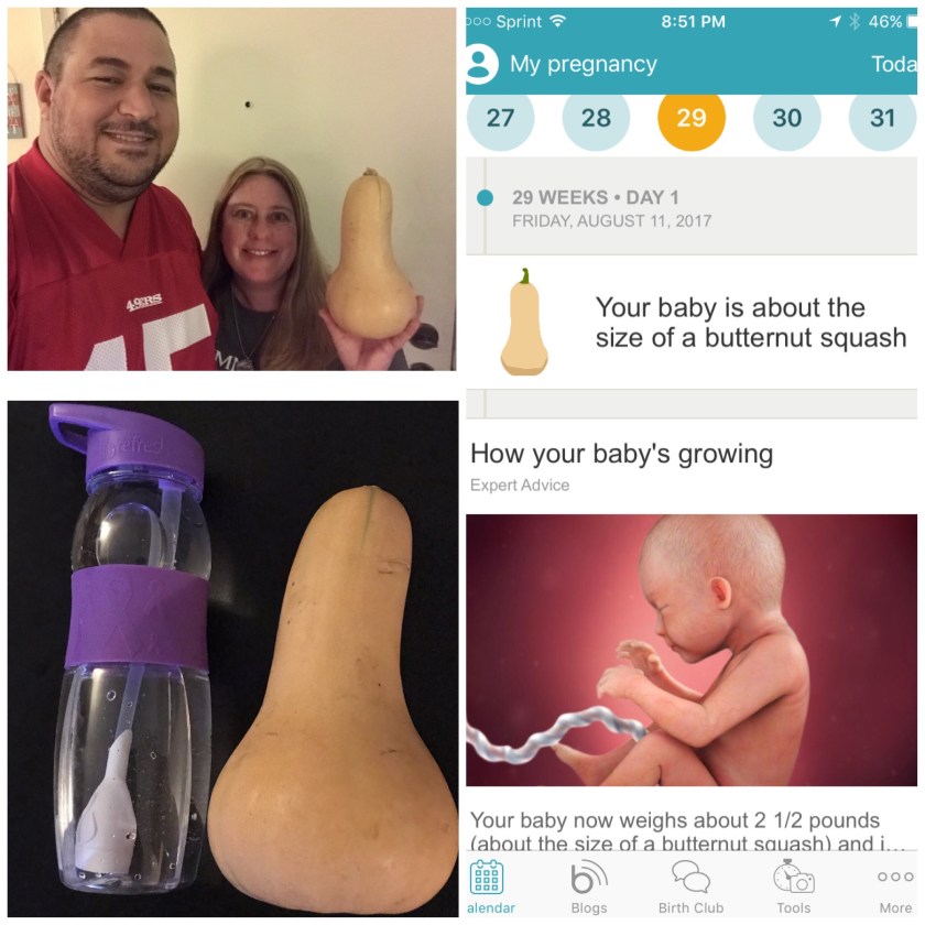 Our baby today is 29 weeks, about 15 inches, the size of a large butternut squash and weighing 2 1/2 pounds. For size comparison, I put a squash next to my filtered water bottle that holds 26 ounces of water.