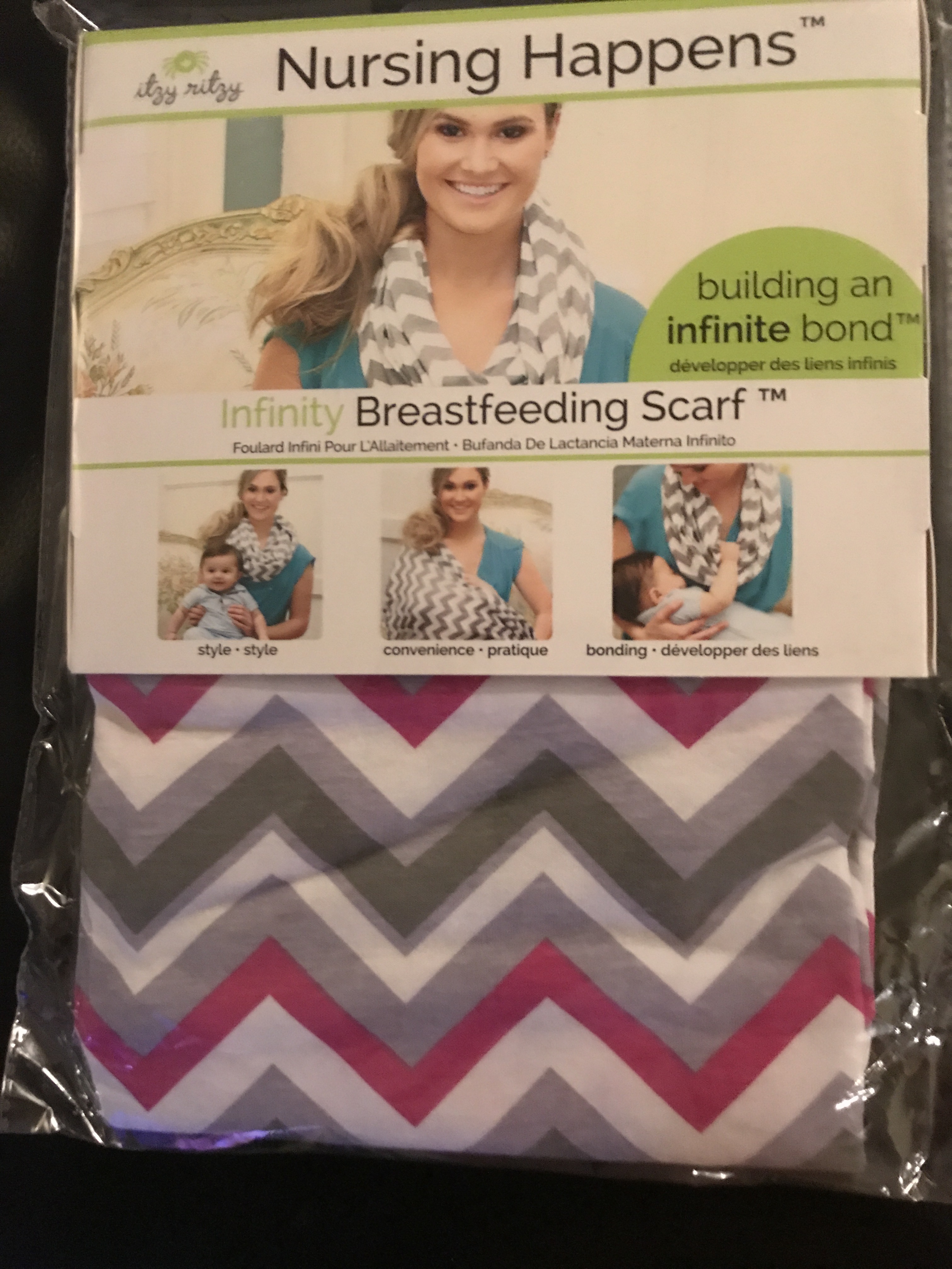 I received Itzy Ritzy’s Nursing Happens Infinity Nursing Scarf in my Bluum box last month. As I said on that entry, the product, especially when compared to the one on the photo of the package in gray and white, resembles greatly one I’d put on my Amazon baby registry in black and white. Still, I’d received one that was much more colorful as you can see below, including a pattern with black, white, gray and hot pink in it.