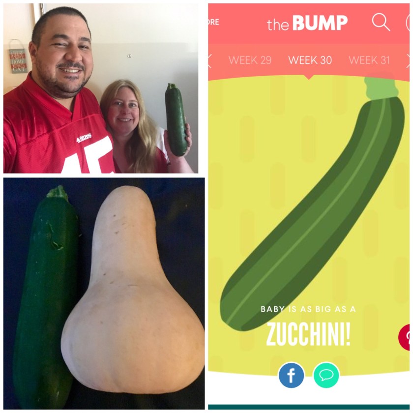 Our baby is 30 weeks today, the size of a large zucchini at 15 3/4 inches long and weighing almost 3 pounds. For comparison I put this week’s vegetable next to last week’s vegetable, the Butternut Squash.