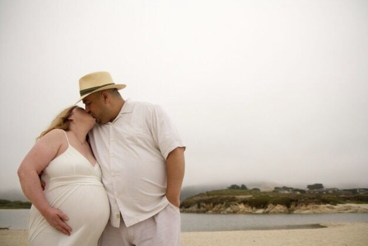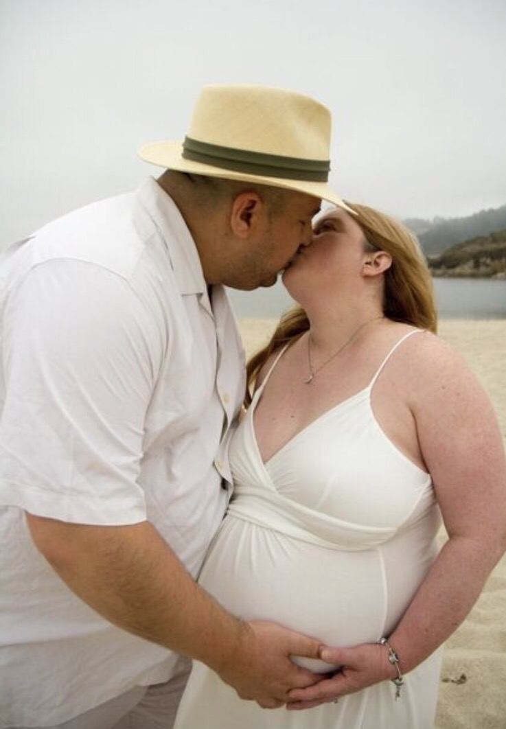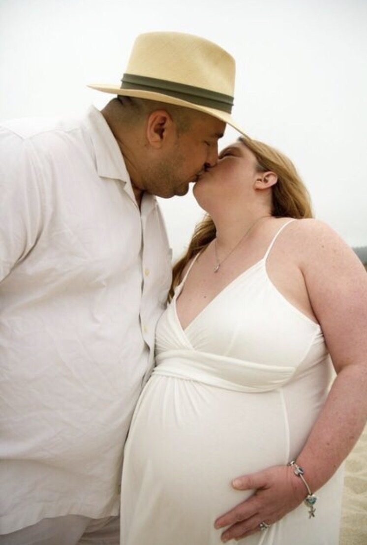 I’d envisioned wearing a fitted white dress for the second part of my maternity shoot ever since we set a date for it. Our photographer, Rachel, had recommended Matt wear light colors, so he wore white, grey and the Panama hat he wore on our wedding day. For jewelry I wore an aquamarine heart necklace and sea inspired Pandora type charm bracelet, both presents from Matt for our first wedding anniversary.