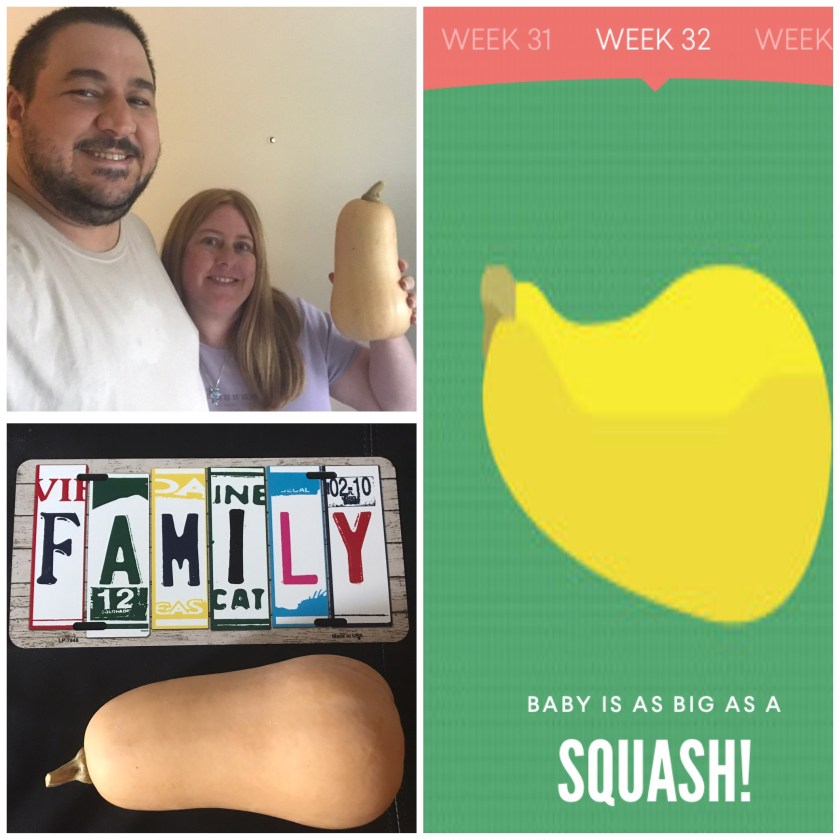 Today our baby is 32 weeks. This puts him or her at the size of a jimica according to BabyCenter or as we were unable to find one at our supermarket, a squash, at 3 3/4 pounds and 16.7 inches long. For size comparison I put the squash up to the Family license plate style picture we used in our maternity shoot.