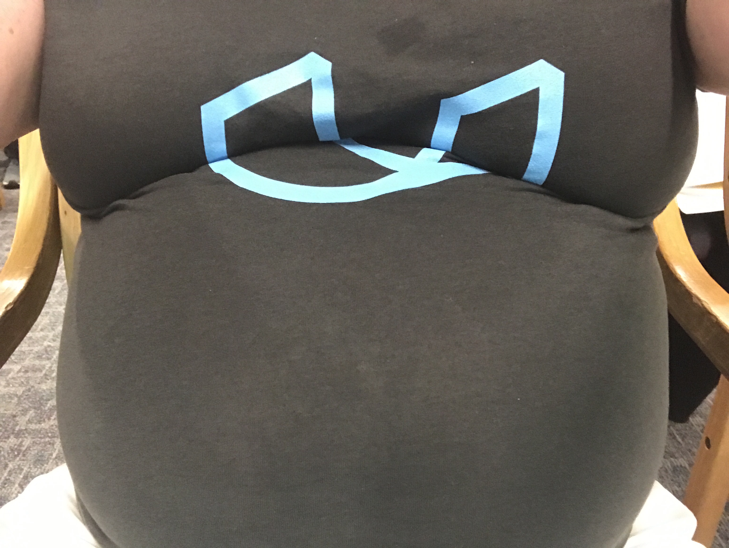 I was thrilled to learn so many unexpected things in class. I had worn a T shirt with a U for University on it, yet while seated it looks like this.