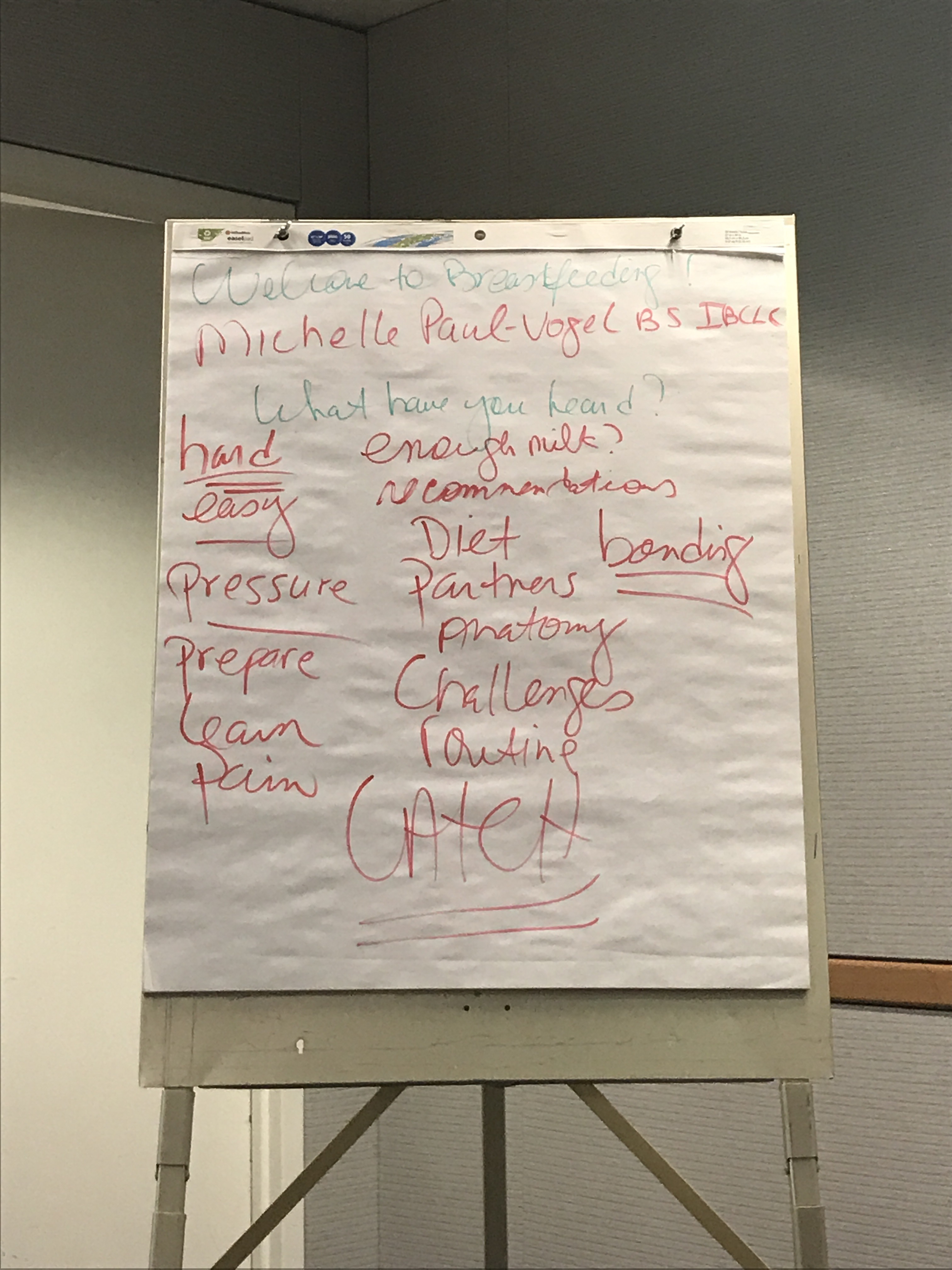 At the beginning of the class the mom’s were asked to inroduce ourselves by name, due date, baby’s gender and something they had heard about breastfeeding, which our instructor, Laura, put on a flip chart. Out of twenty mom’s, I was the only one that does not know the gender.