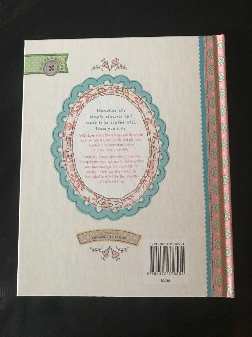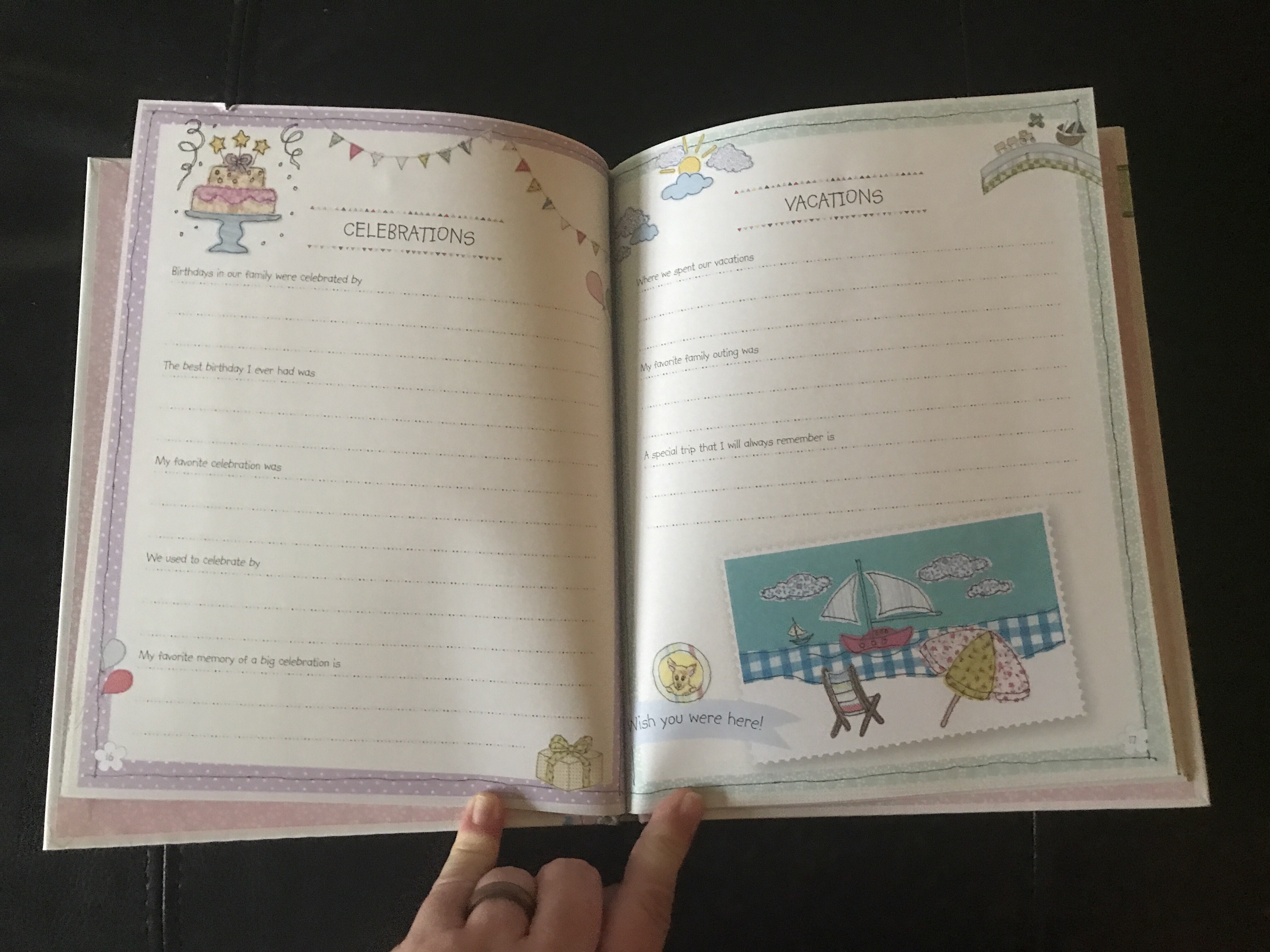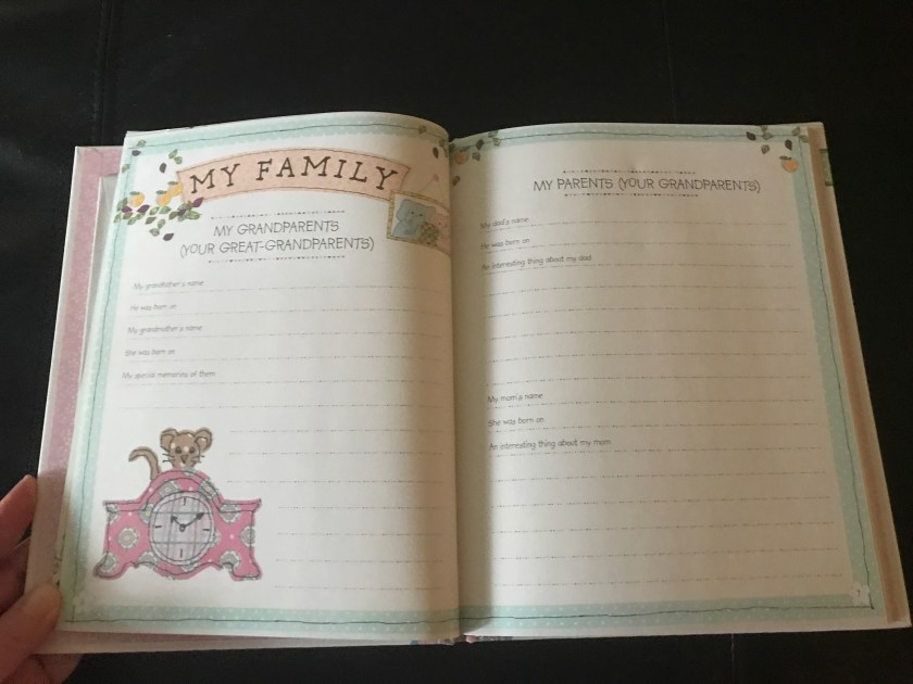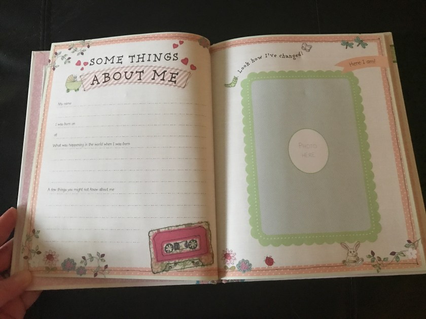 The book is certainly thorough, having lots of questions and spaces to answer them and has a place to put a younger photo of yourself (as it doesn’t say how much younger to put one in some moms would use a baby photo, some a childhood one, some as a young adult, etc.).