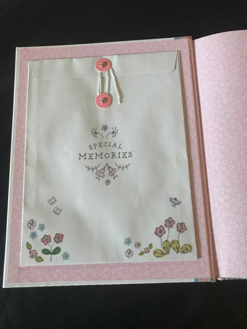 One thing I absolutely love about the book is the front pocket for special memories. It’s open ended so a mom can put in things like sonogram pics, the hospital admission and/or baby’s bracelet, a lock of baby’s hair, etc. It’s a great addition to the book.