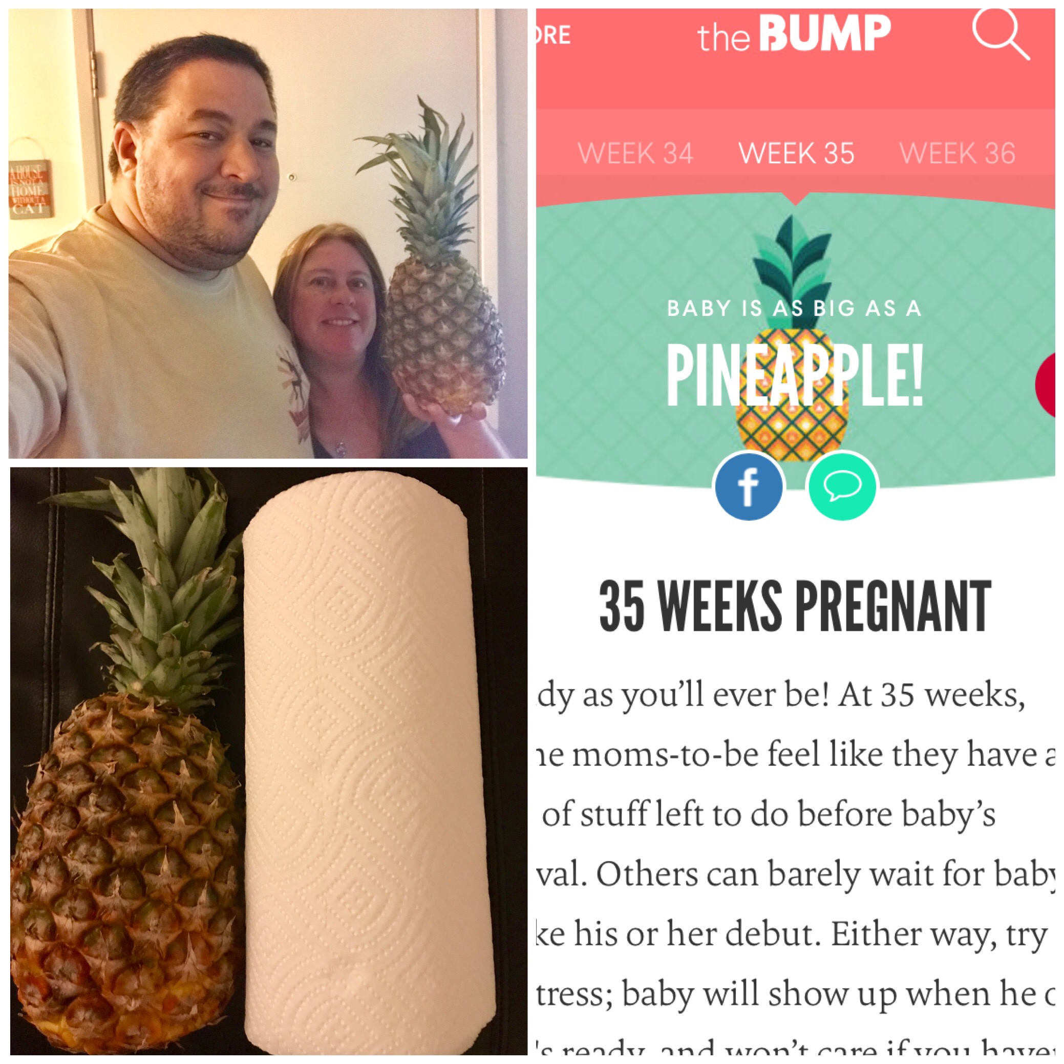 As of today, our baby is 35 weeks, the size of a pineapple according to the Bump and the smaller (in most cases) honeydew melon according to Baby Center. At this stage the baby should be about 18 inches long and 5 1/4 pounds (a bit bigger than Dr. C estimated on my appointment on Friday). This will be one of many weeks in which s/he will be putting on even more weight though his or her length may not change greatly.