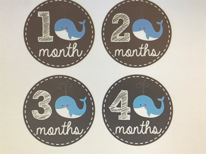 Still, I just feel the stickers aren’t enough fun for me to even imagine taking out of the box and using. I decided to see if I found a sticker set with even less options if I’d still favor the cards over them and among other options found this one image whale set which fits with our baby’s theme. Even though these would have the same design for each month I couid envision buying and using them much more than the Pearhead set.