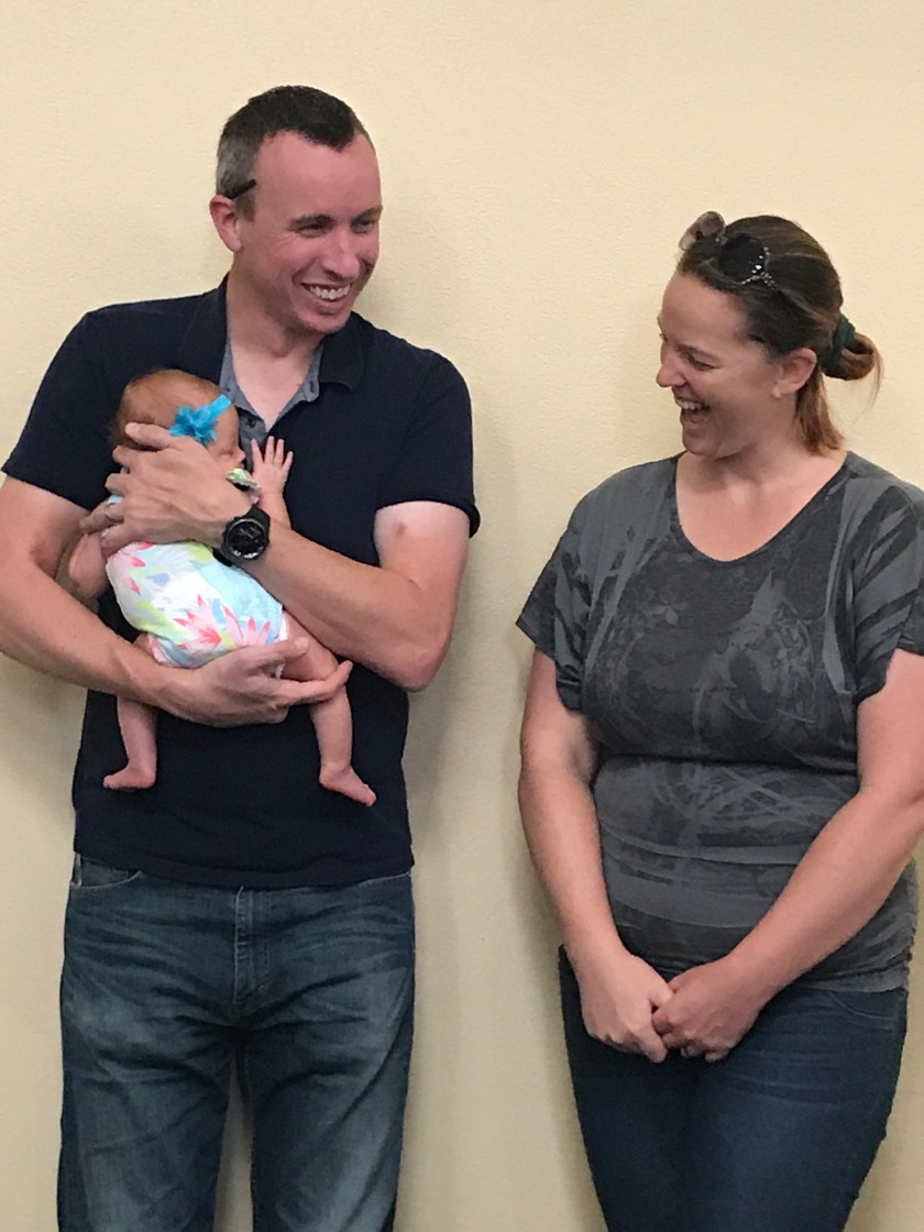 Today during the part I’m church when new visitors may introduce themselves if they choose, Pastor Mariellen announced it was Kira’s first time visiting. Everyone turned to see Sean and Ashley’s seven week old daughter.