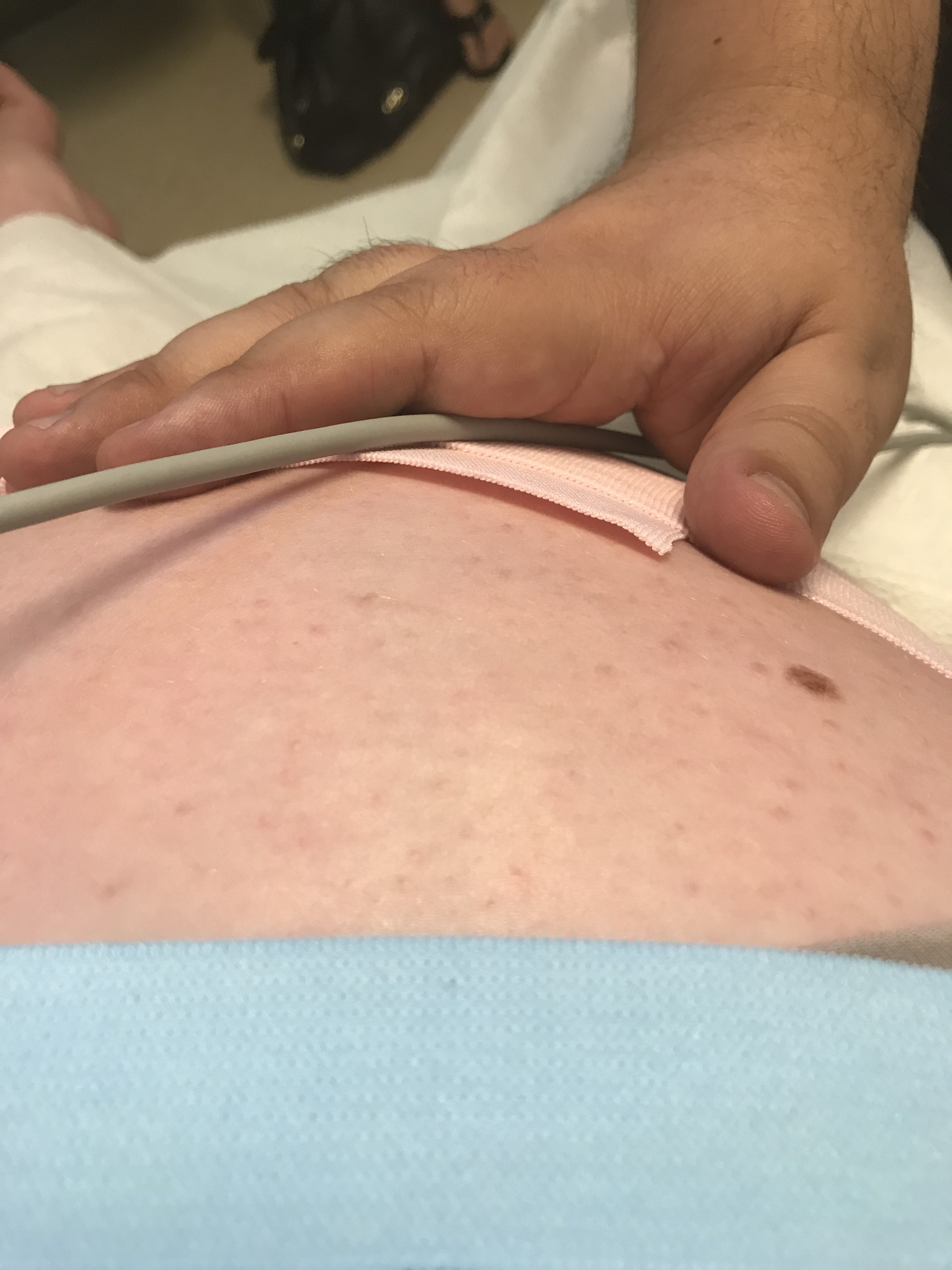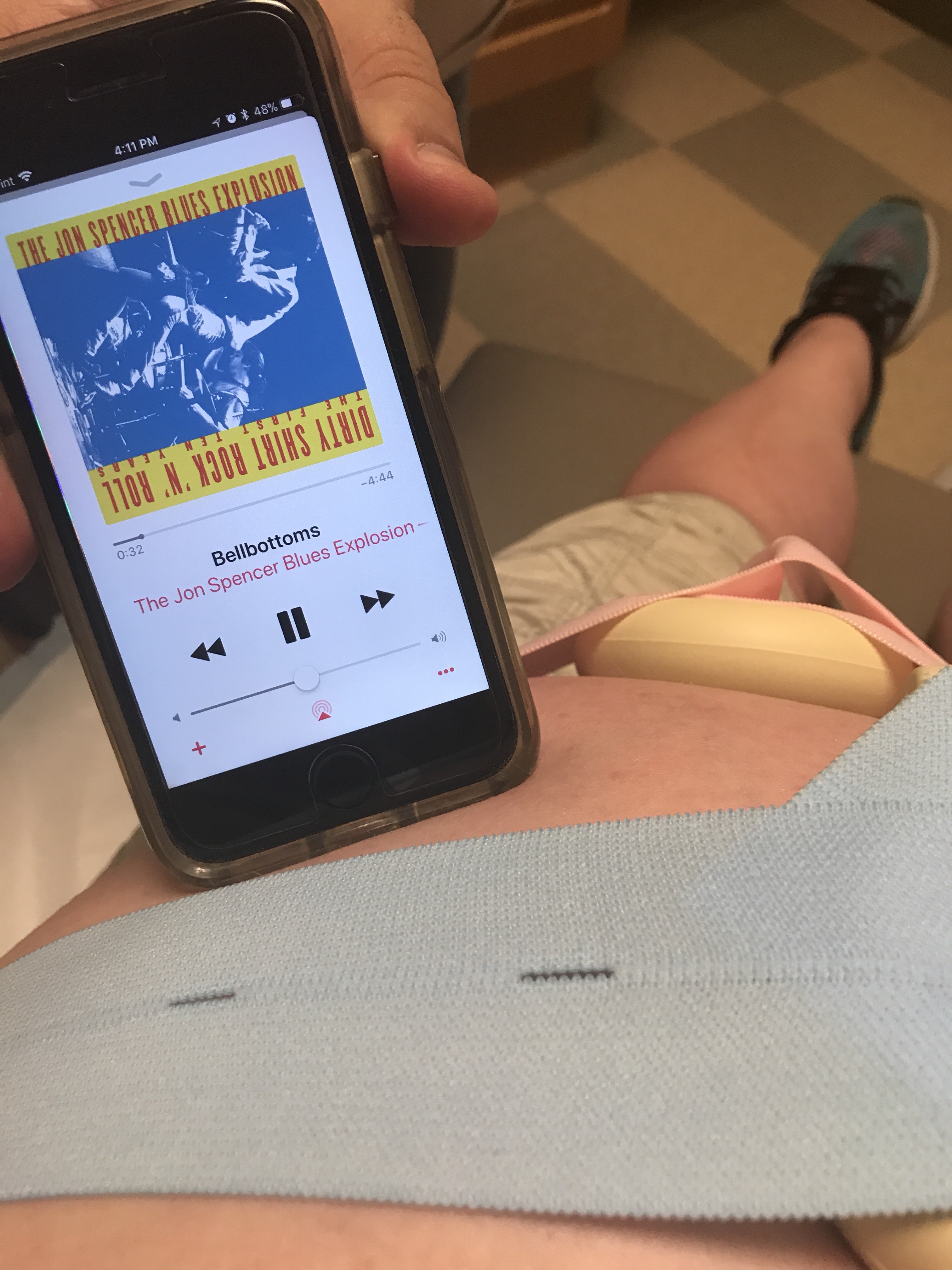 So to help the baby wake up and move more, Matt put his iPhone playing music up to my bump.