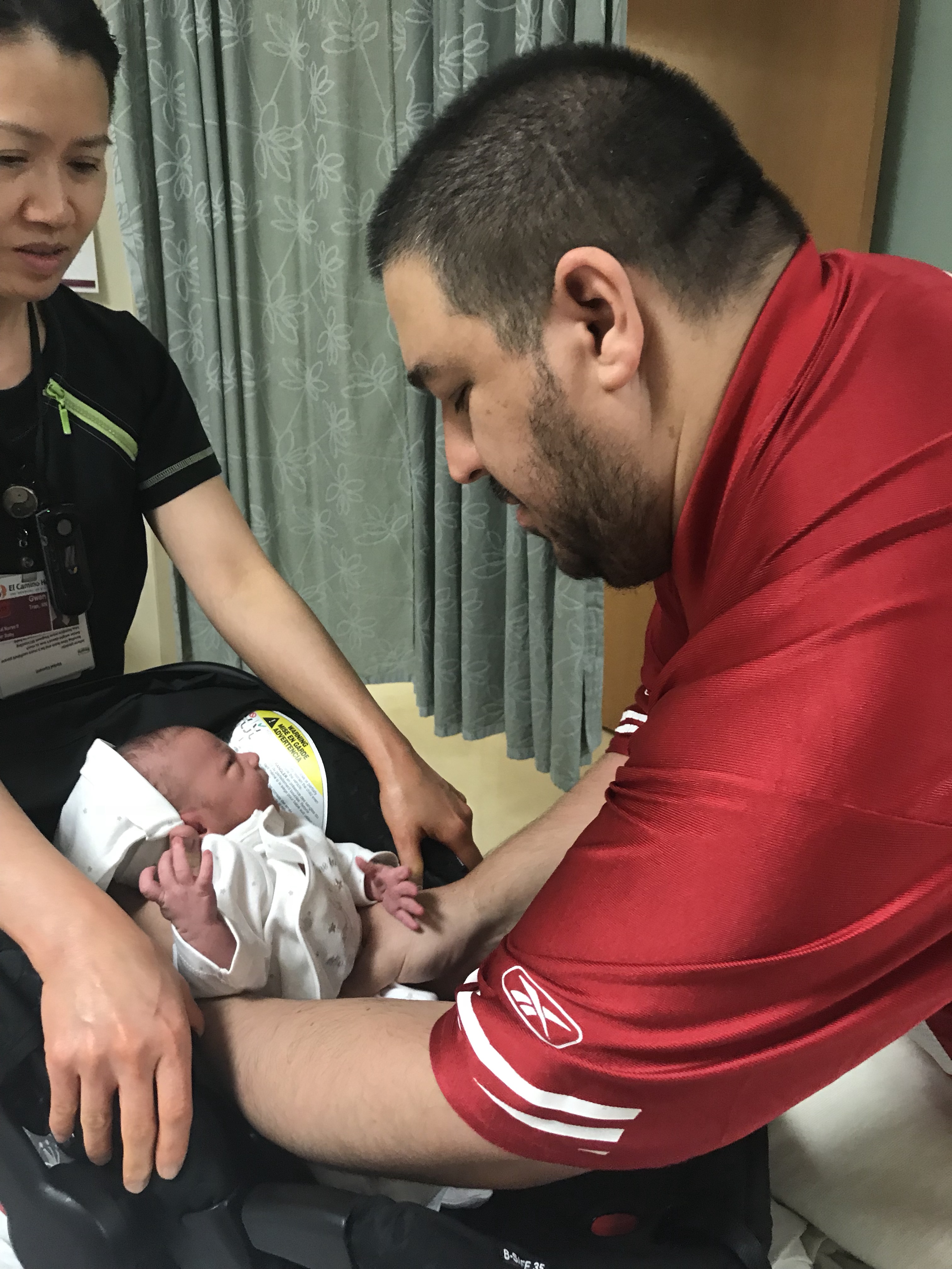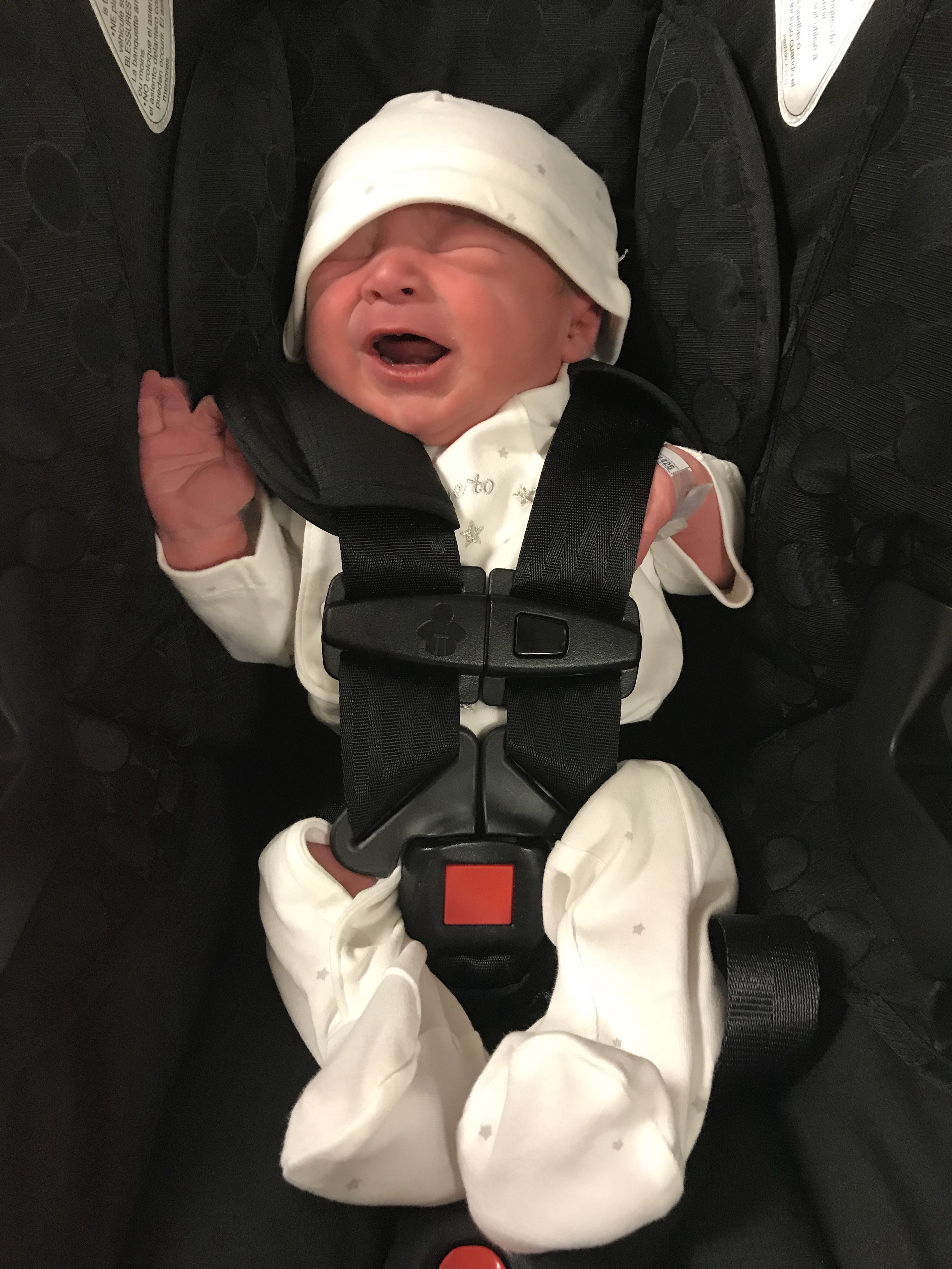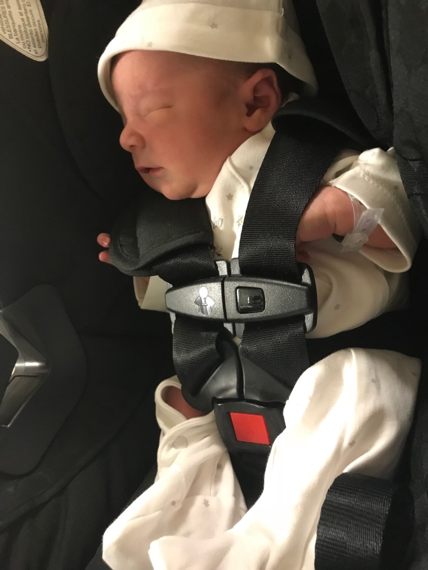Per hospital policy, two volunteers came to our room. One to help me get in and be pushed in a wheelchair with the car seat and baby on my lap, and the other to wheel our stuff down on a cart.