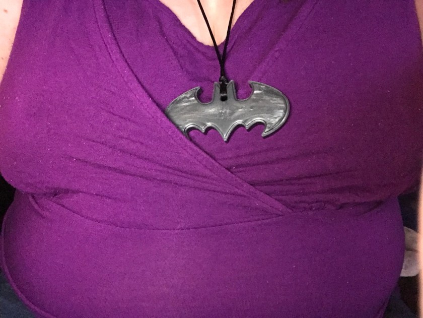 I’ve loved the idea of a teething necklace with breakaway clasp that I could wear while nursing, especially since I received one long ago from Bluum. Still I rarely wore that one for two reasons: it was incedibly long on me, and, as neither they nor I knew my baby’s gender upon sending it had mainly pink beads and I wanted something a bit more gender neutral perhaps even masculine as William is a boy. I was excited to see the Bumkins Batman Teething Pendant for sale on Amazon.