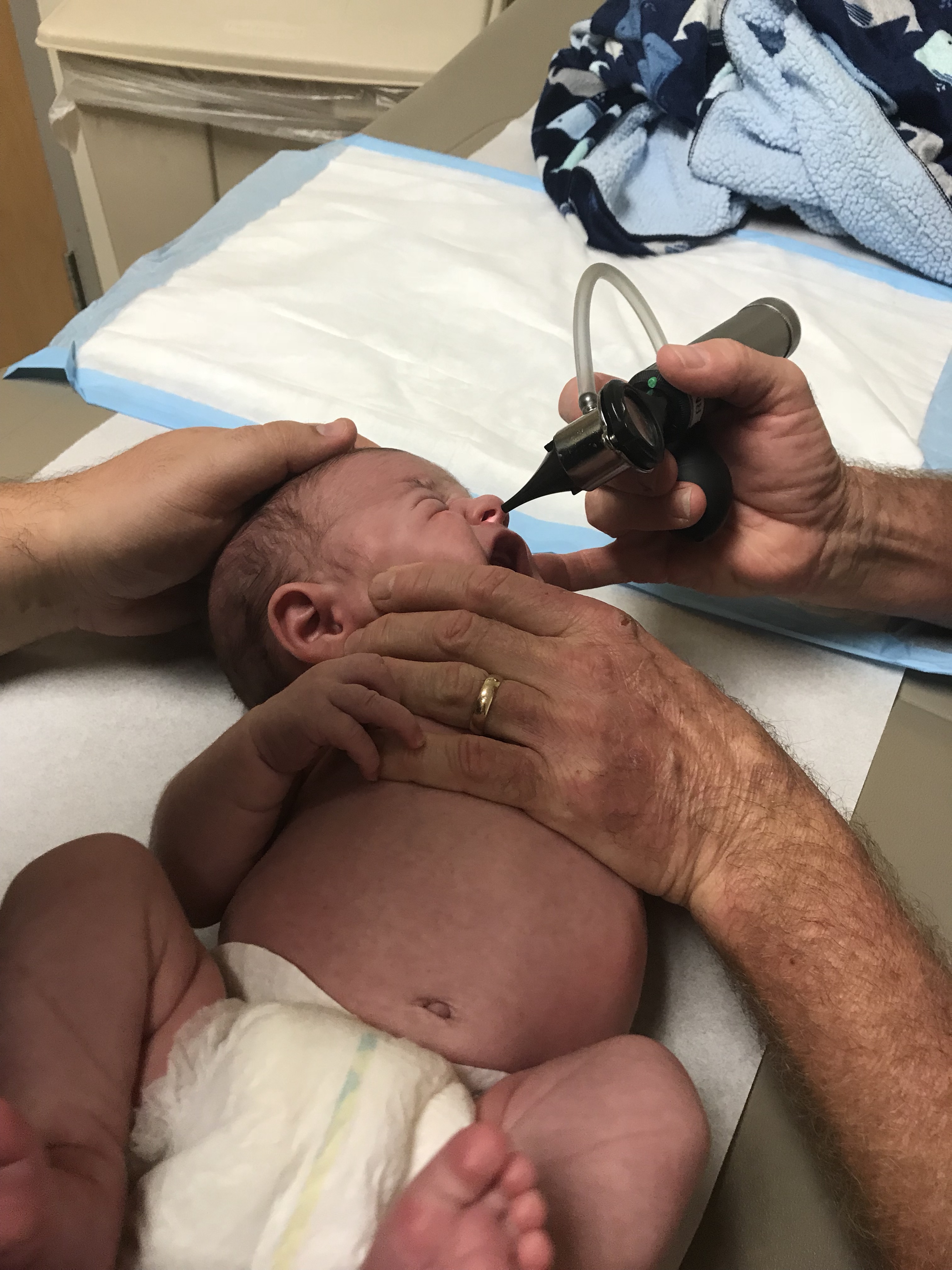 Babies are weighed naked to get a true weight. William is still not a fan of having outfits put on or off, so he cried for his weigh in. The office rounds up so his official weight is 8 pounds and 8 ounces.