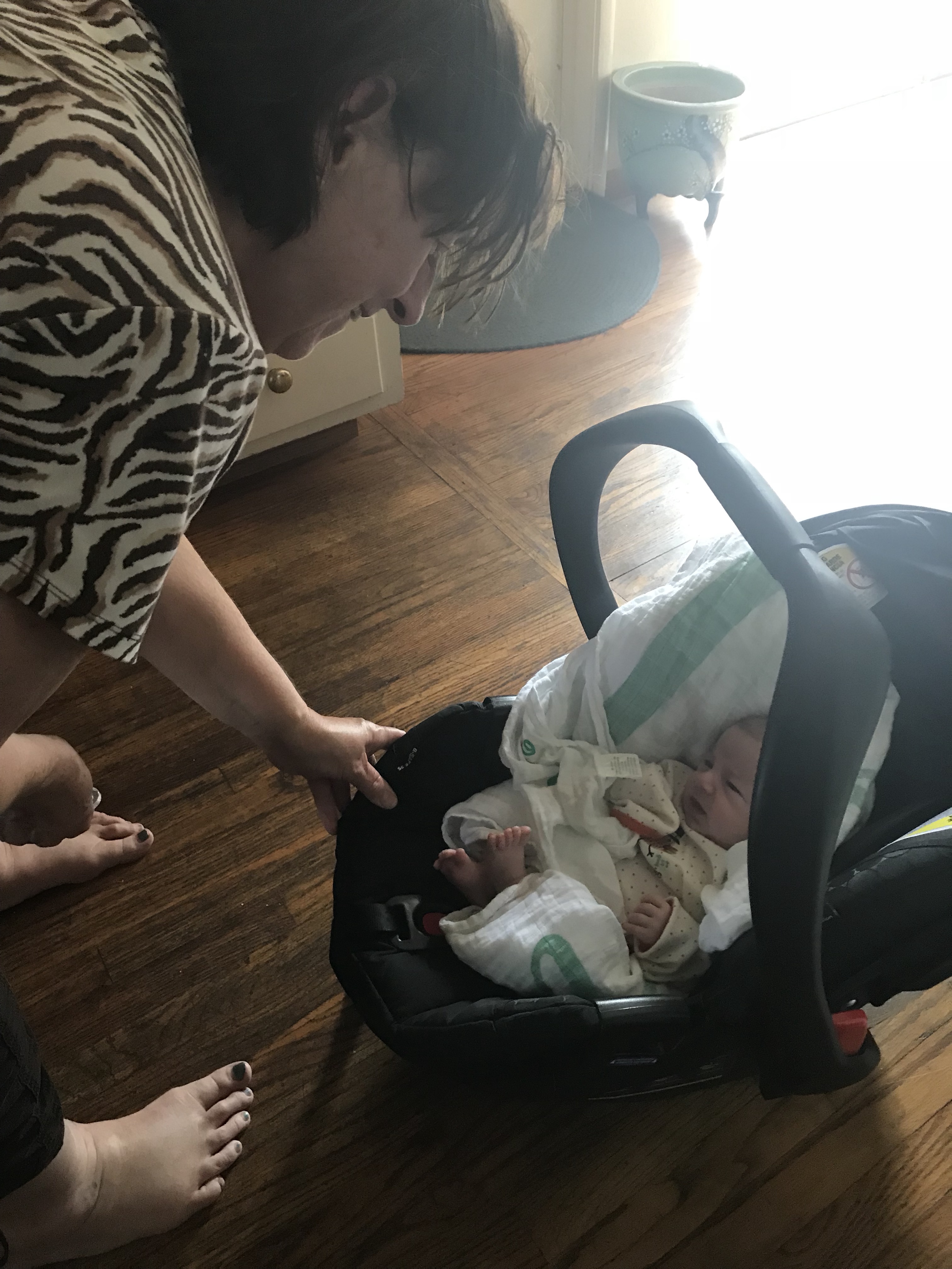 Jennifer and John came over to meet the newest edition to our family. Jennifer wore a beautiful blouse in festive fall colors with leaves on it.