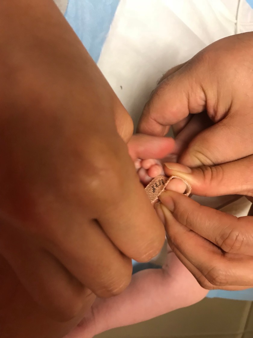 In addition to the regular checks the nurse performs for the doctor, this time a blood oxygen level was added. This is usually measured around the baby’s big toe.