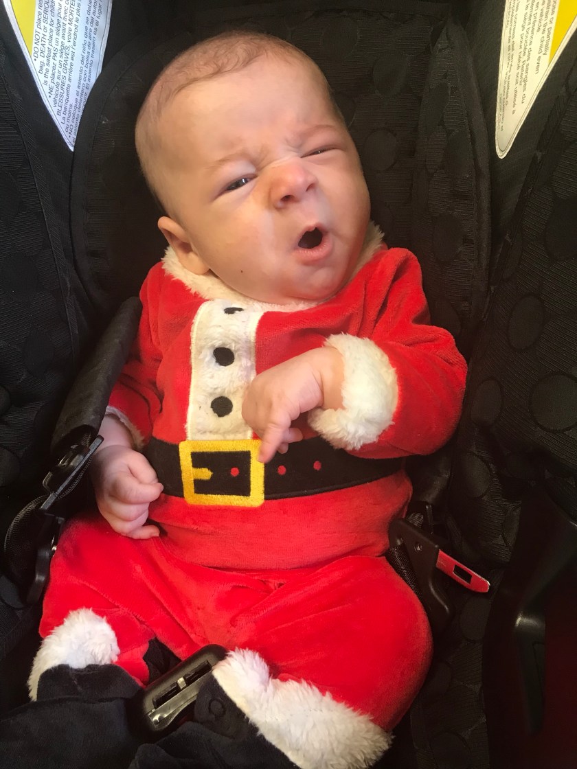 Matt’s workplace had a potluck yesterday to which employees could invite members of their immediate family. William and I were instructed to dress festive, so I was delighted that William still fit in his newborn Santa outfit. He unfortunately has outgrown his matching Santa hat.