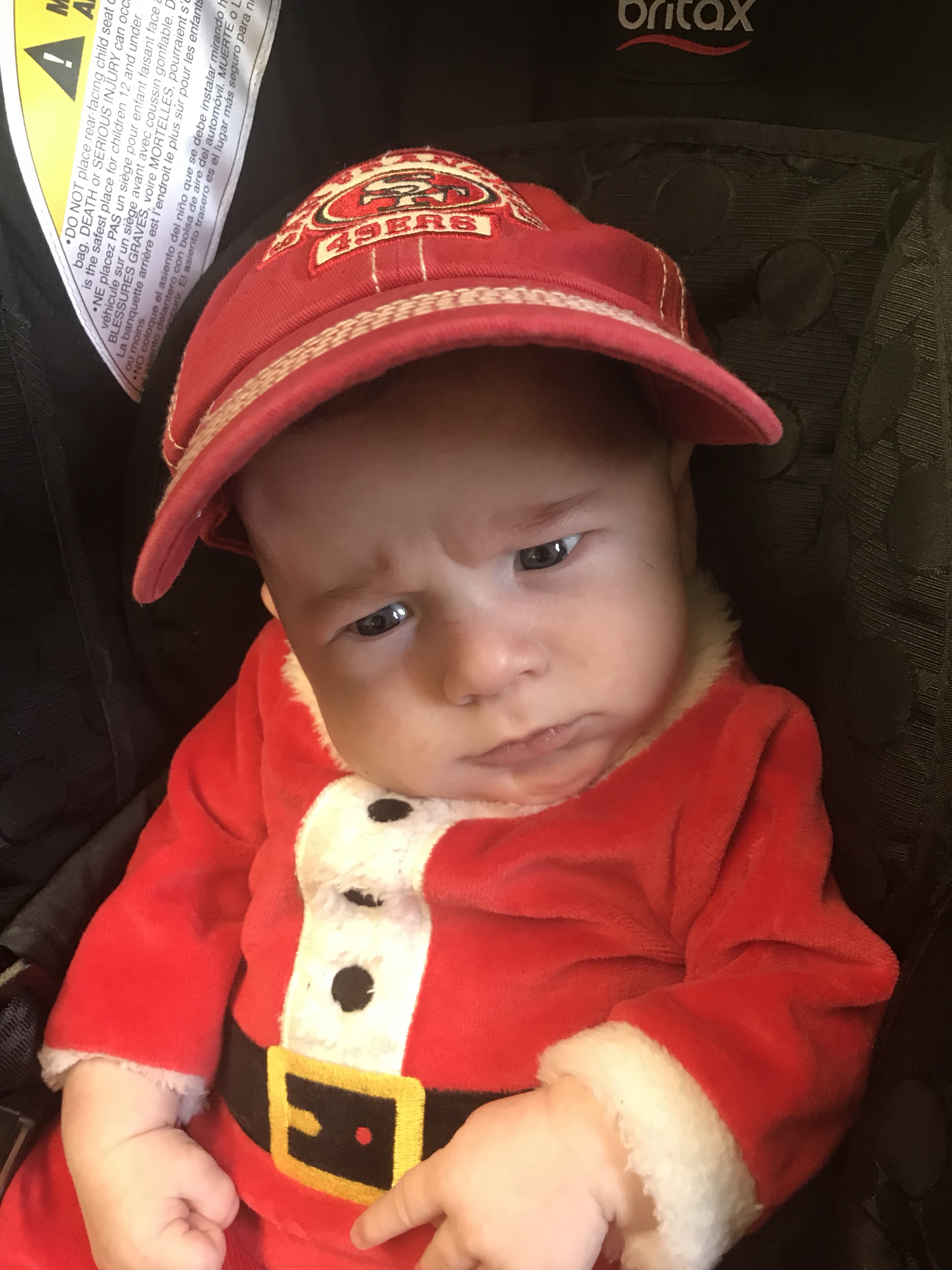 Baby clothes can often share a size yet fit a baby differently. Though his Santa hat is too small for him, the 49ers cap which I originally bought for my maternity shoot, is too big for him despite being labeled newborn as well.