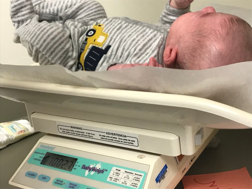 On Wednesday we had our last scheduled visit with my Lactation Consultant, Donna. As I’ve been a bit producing more milk since we started, this visit was to help fine tune the progress I have been making. As always, William vocally protested the naked weigh in. He is now close to 10 lbs in weight.