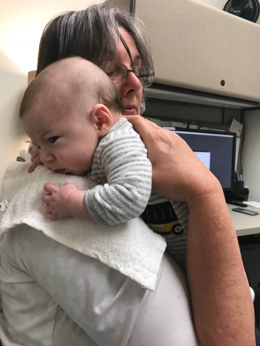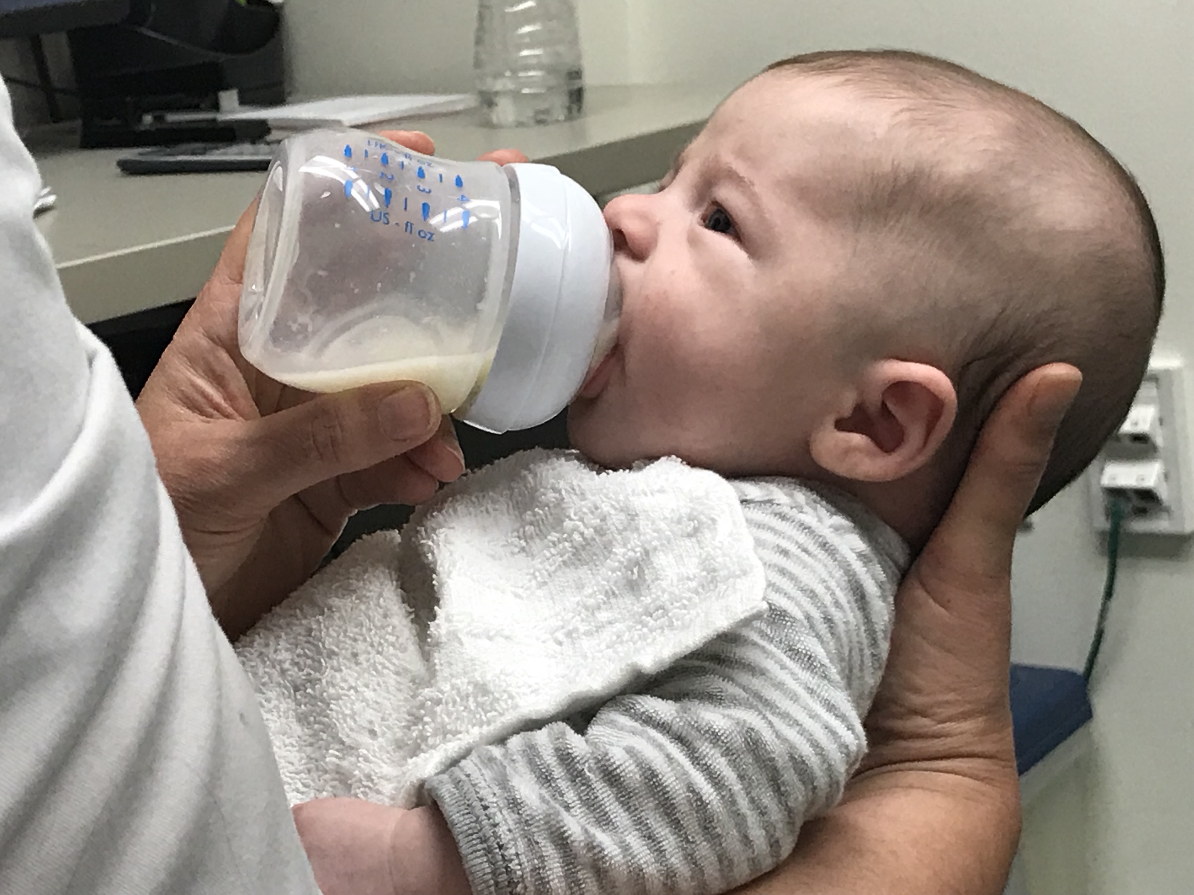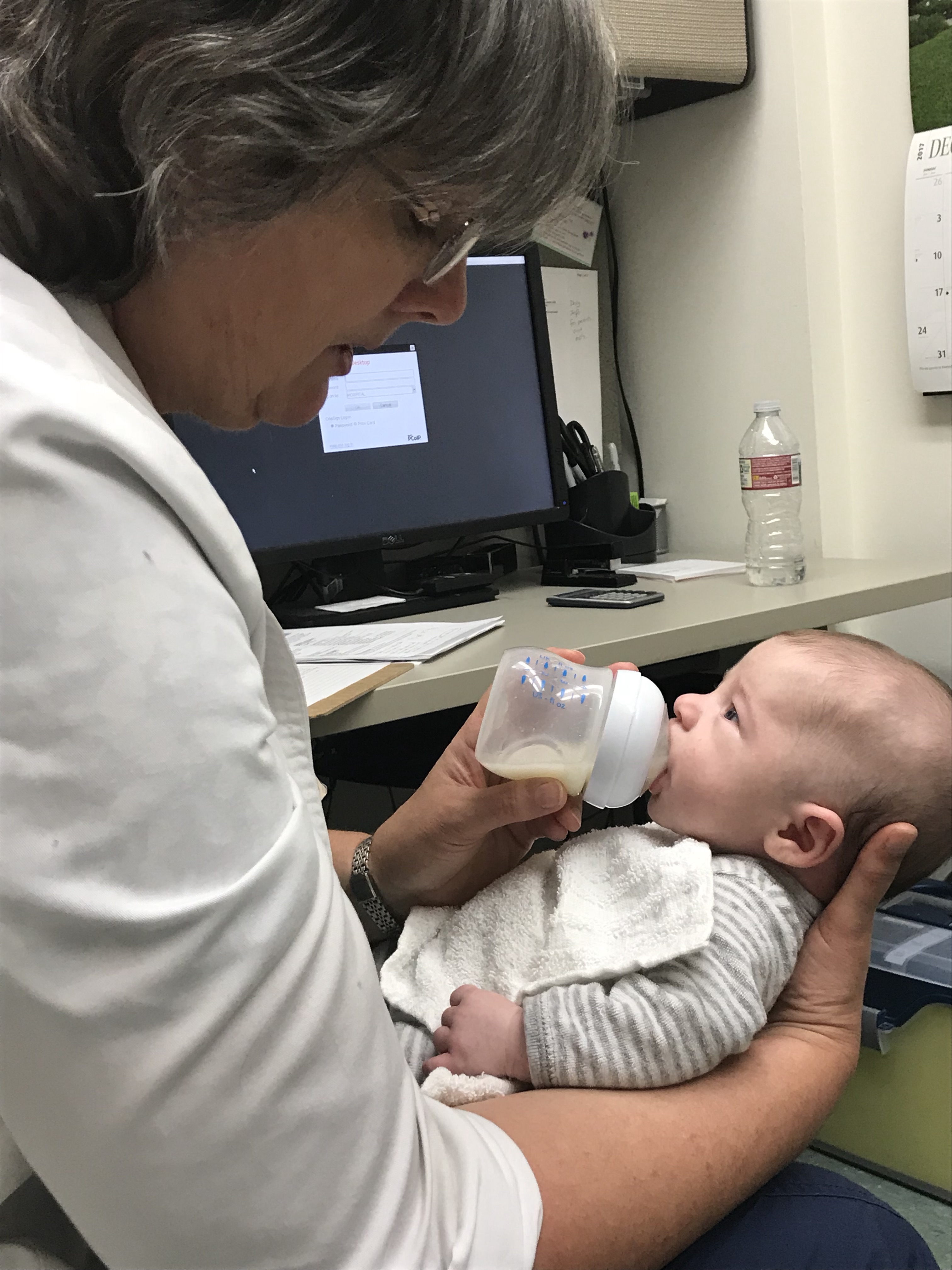 Donna demonstrated a great hold for bottle feeding for him. It even gave her great burp cloth positioning.