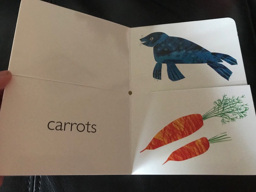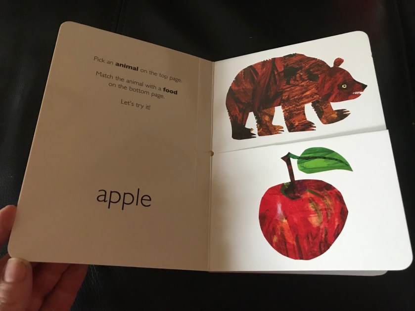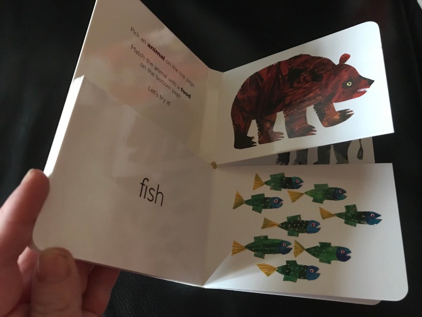 I like the concept a lot, and yet I think it could be a bit confusing. For example, depending on what kind of bear it is, they would happily eat fish and many would even eat an apple (the page the animal lines up with on its actual flip page) though that’s not their first choice.