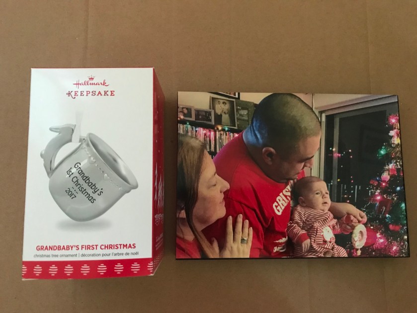 It was the Grandbaby’s First Christmas 2017 ornament on the left from Hallmark, one of her favorite companies for Christmas items. The mini wood canvas on the right was a stocking stuffer from me to Matt.