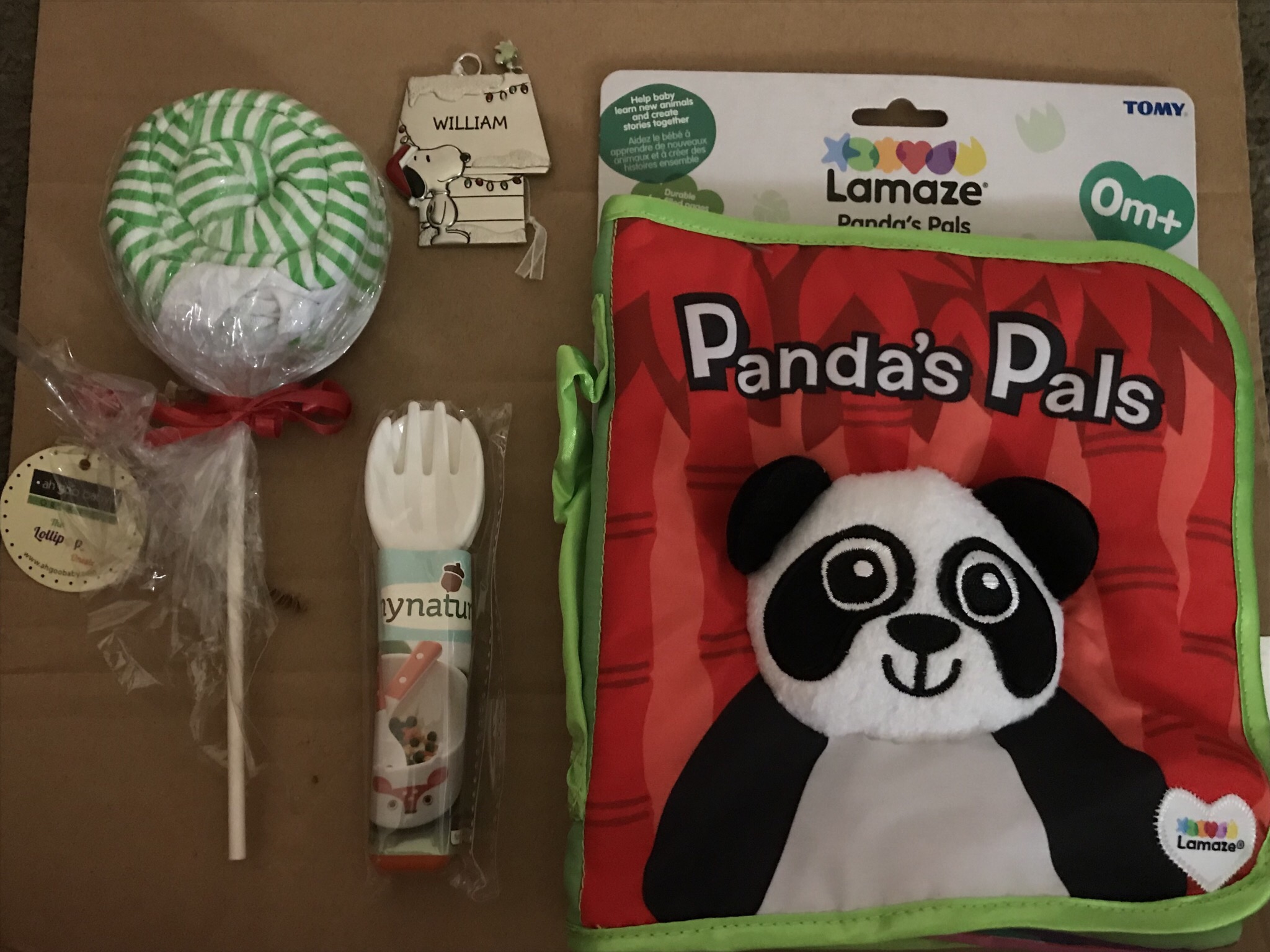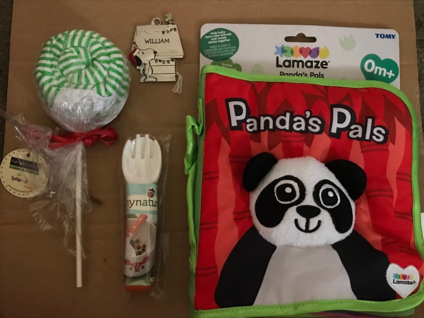 He also received practical gifts including a onesie (wrapped up to resemble a lollipop), eating utensils for the future and a new soft book he can hold in his hands. The stockings I received as a child also had a mixture of fun and practical gifts.