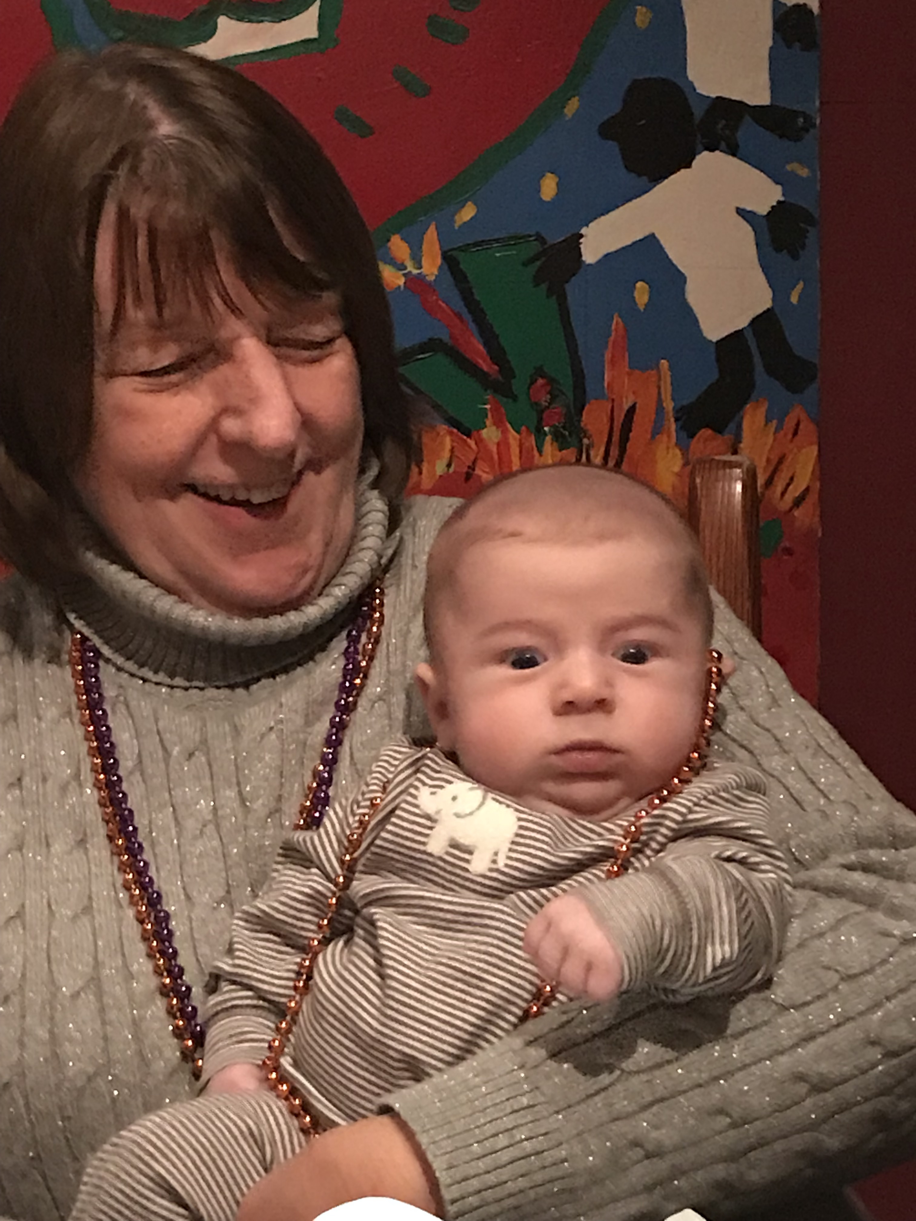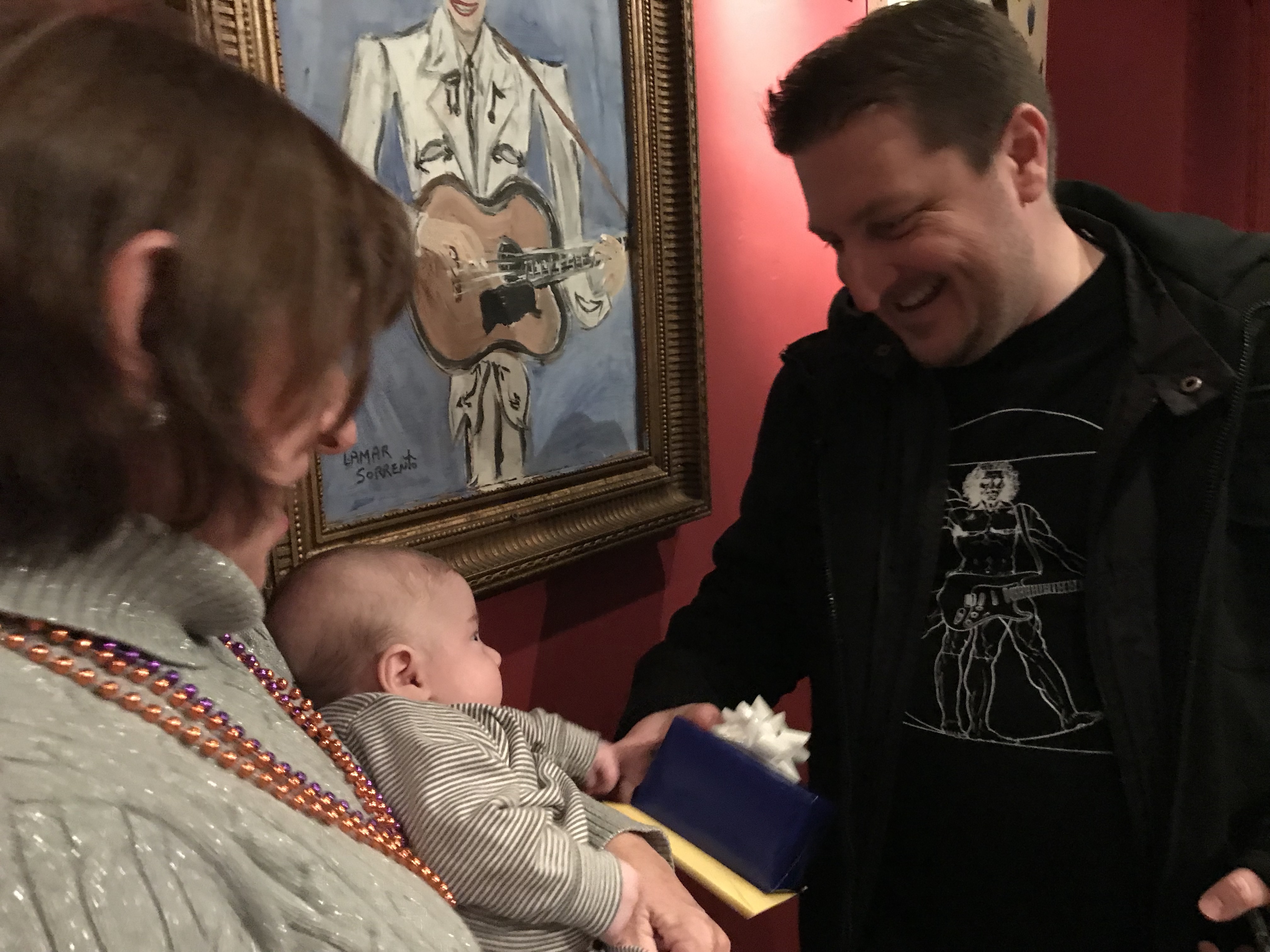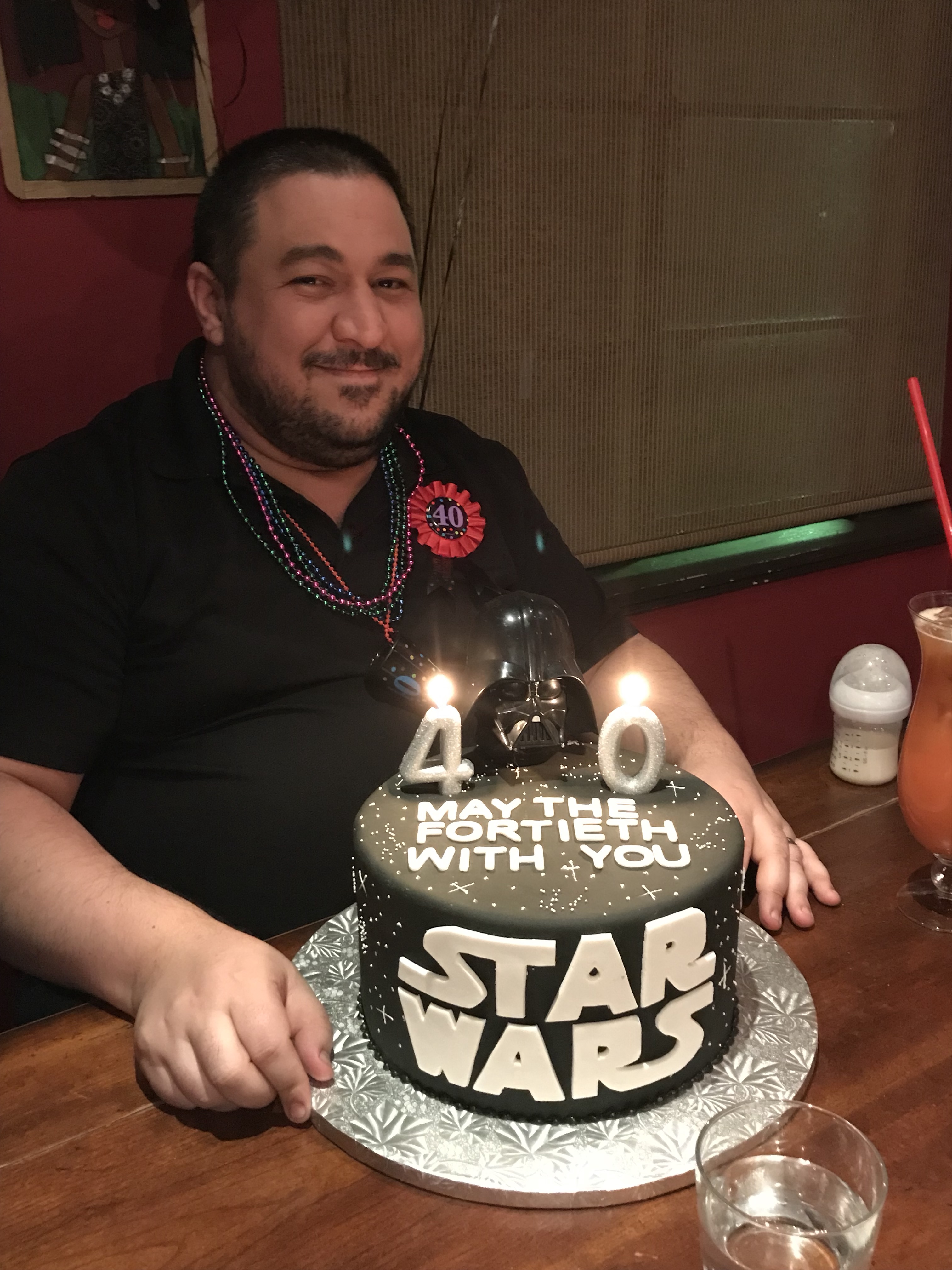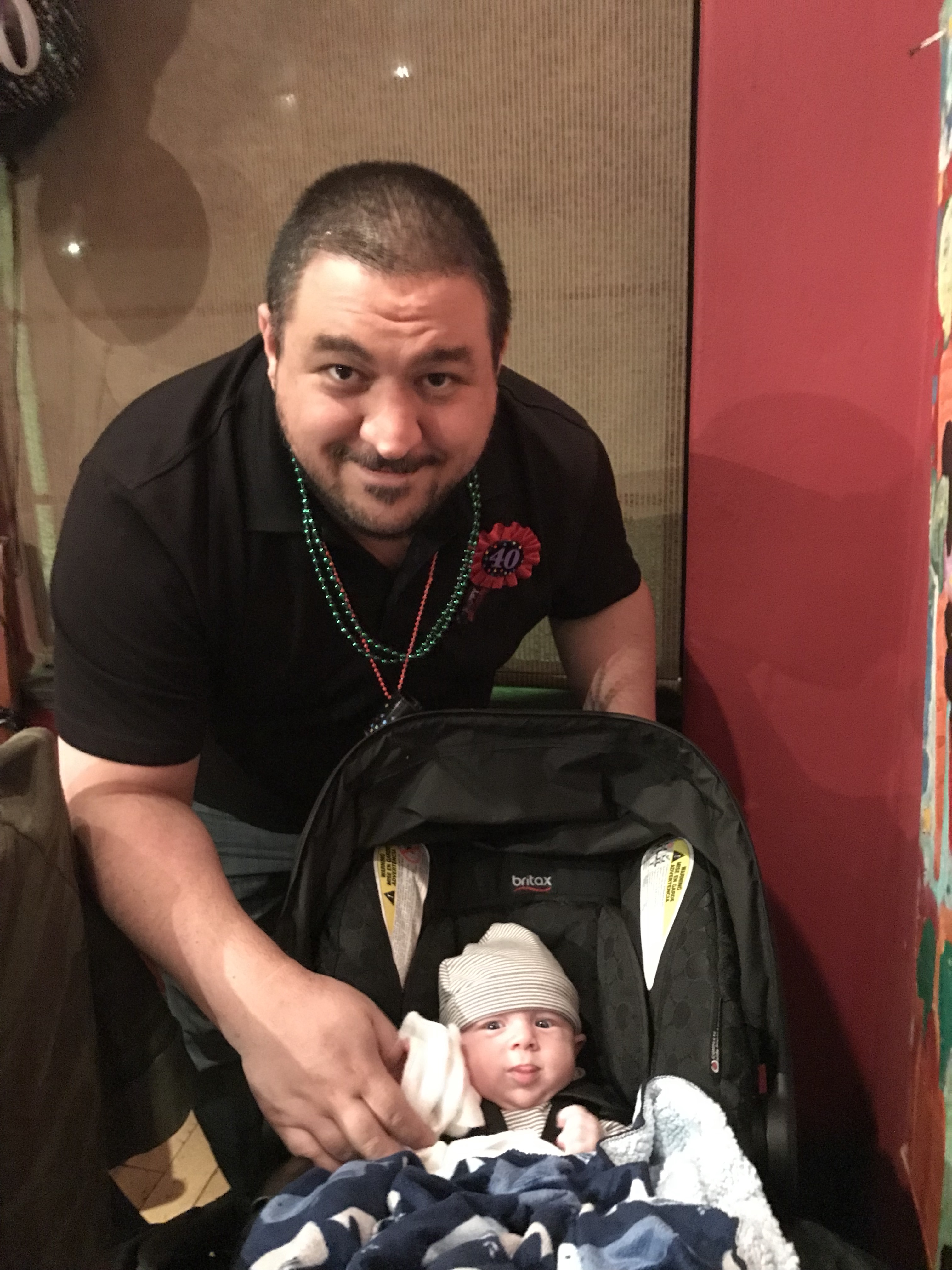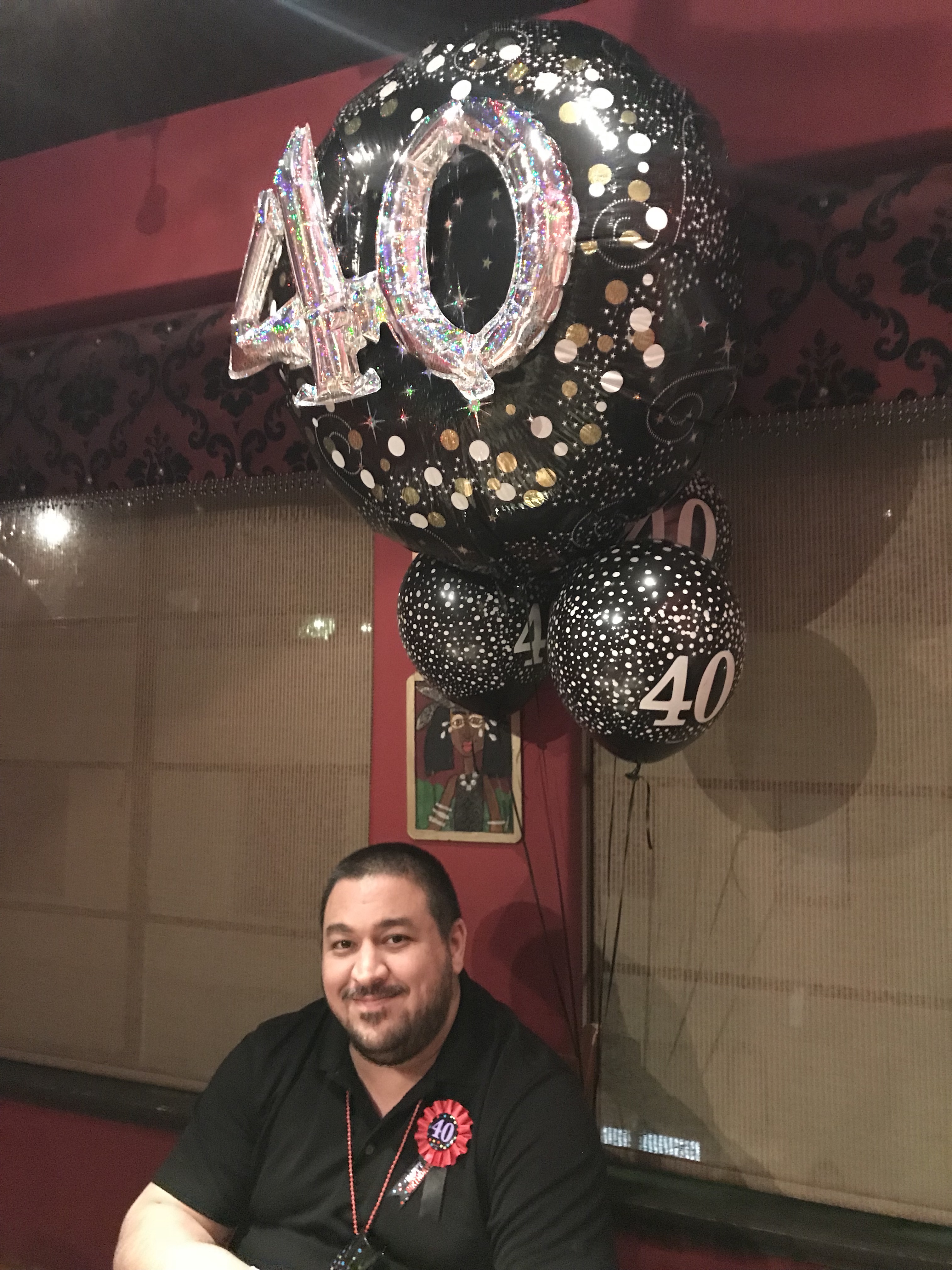 Years ago Matt had bought Candy big balloons for her birthday at Nola. This year she bought him a 40th birthday balloon set, shot glass necklace and pin.