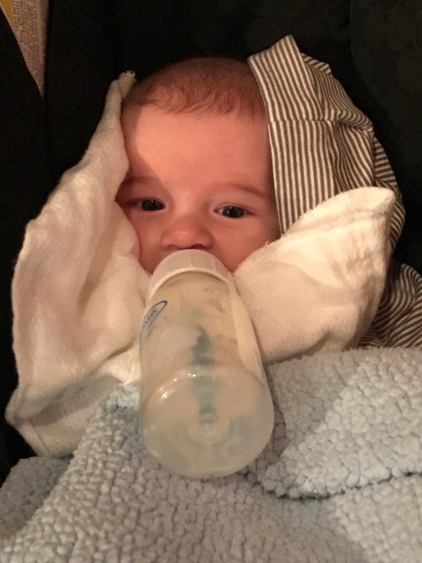 While this hat did fit William, he was happy when it slipped off from motion. I couldn’t resist taking his picture like this with the hat now pushed to the side and burp cloth around his face to help him stay warm as he ate.