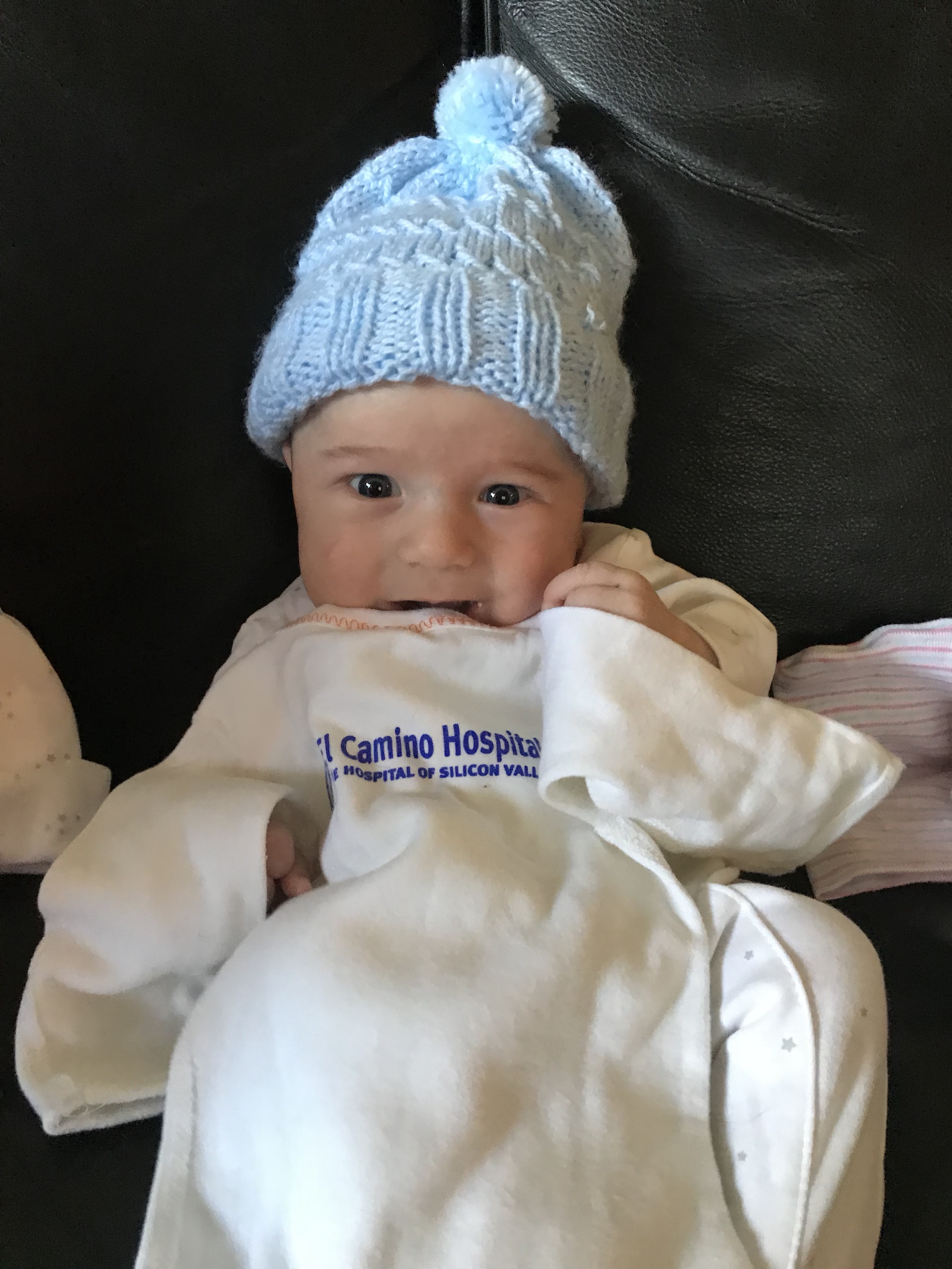 In this photo with beautiful hat and blanket from Kathy, he seems to want to start a fight.
