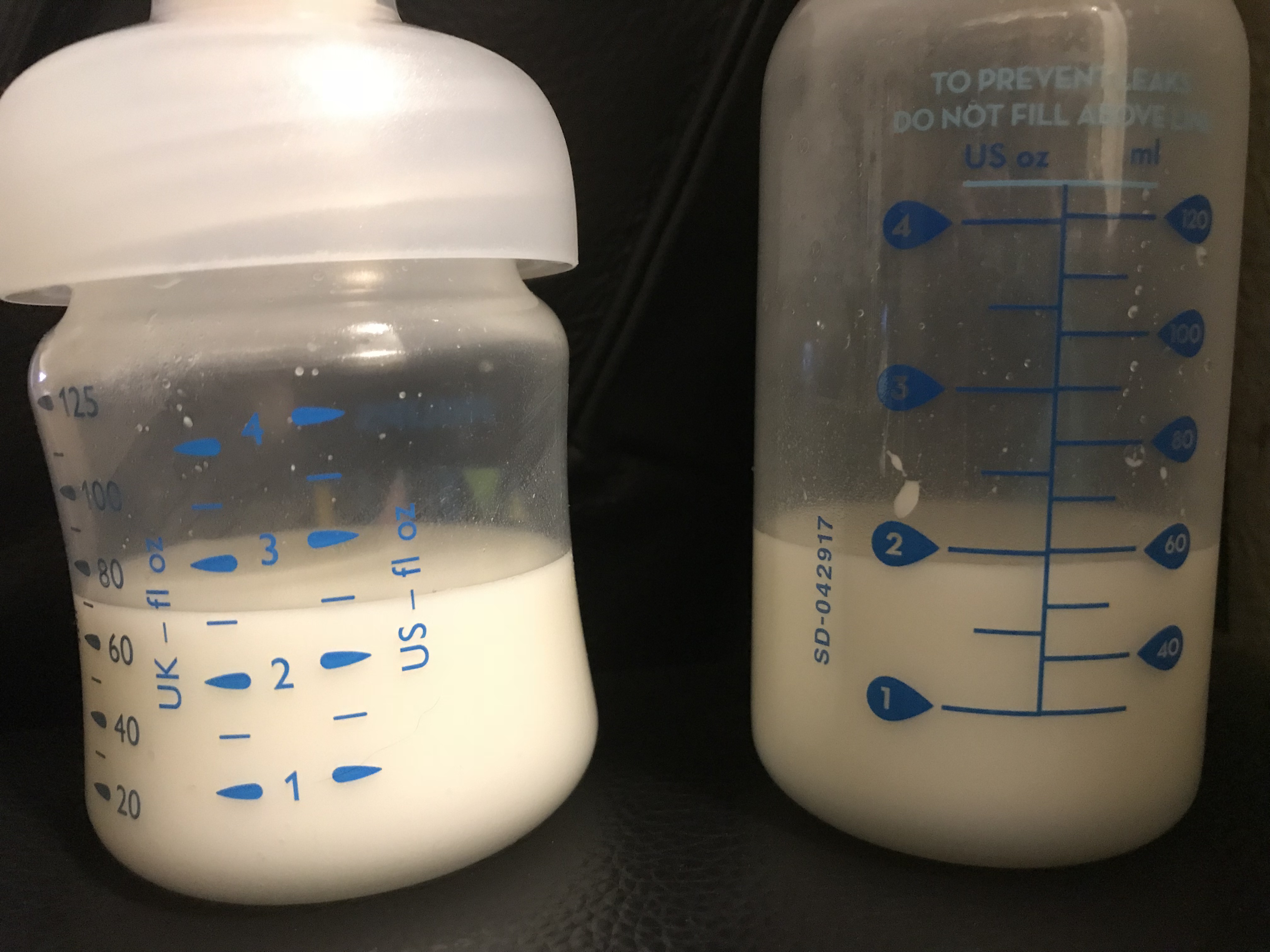 Some sessions I collected more than others. The time of day still mattered, regardless if I use a manual or an electric pump, the earliest in the day collections are usually the more fruitful for me. One day for comparison I pumped the right side, put in in a bottle container for measurement and then did the left. This was one of my best pumping sessions to date.