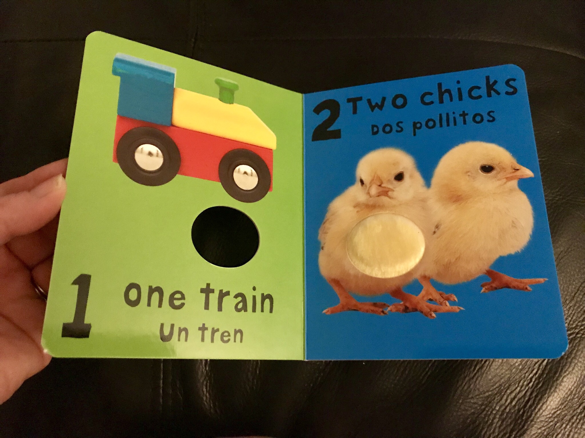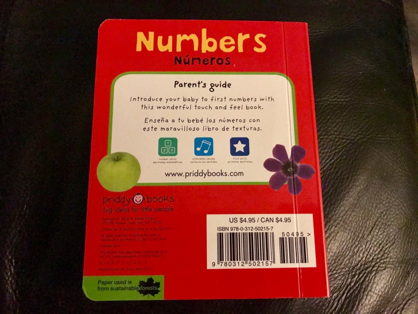As parents, Matt and I are delighted that William will be exposed to English and Spanish both at daycare. This may help make it easier for him to learn and retain Spanish, a commonly used language in California, at a later age. To help his learning and retention, I bought two bilingual books for Maribel to read to him including Numbers / Numeros. I first noticed this book due to the soft area on the front where a baby can feel what the down of a chick (un pollito) might feel like.